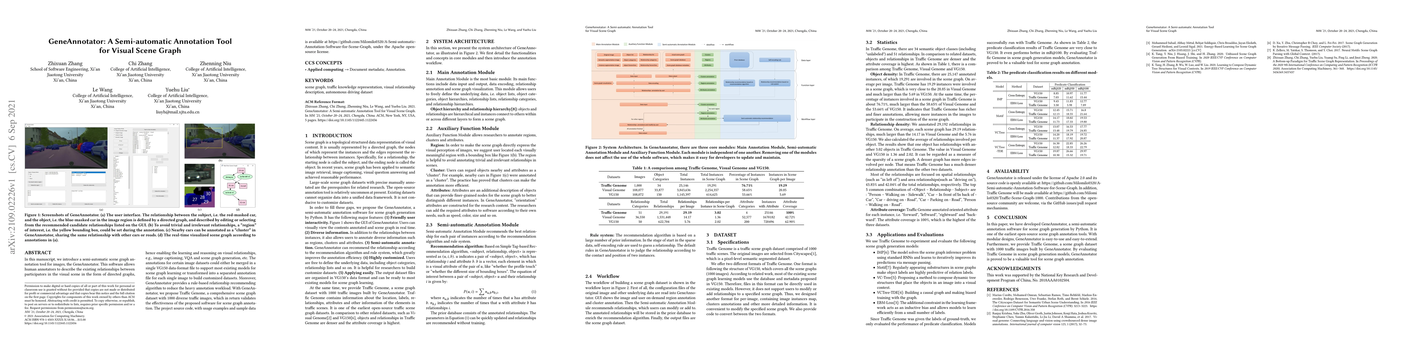 The paper introduces GeneAnnotator, a semi-automatic annotation tool for visual scene graphs, which allows human annotators to describe relationships between scene participants as directed graphs. It features a user-friendly interface, diverse information annotation (regions, clusters, attributes), semi-automatic annotation via a rule-based relationship recommending algorithm, and the ability to customize data definitions.
