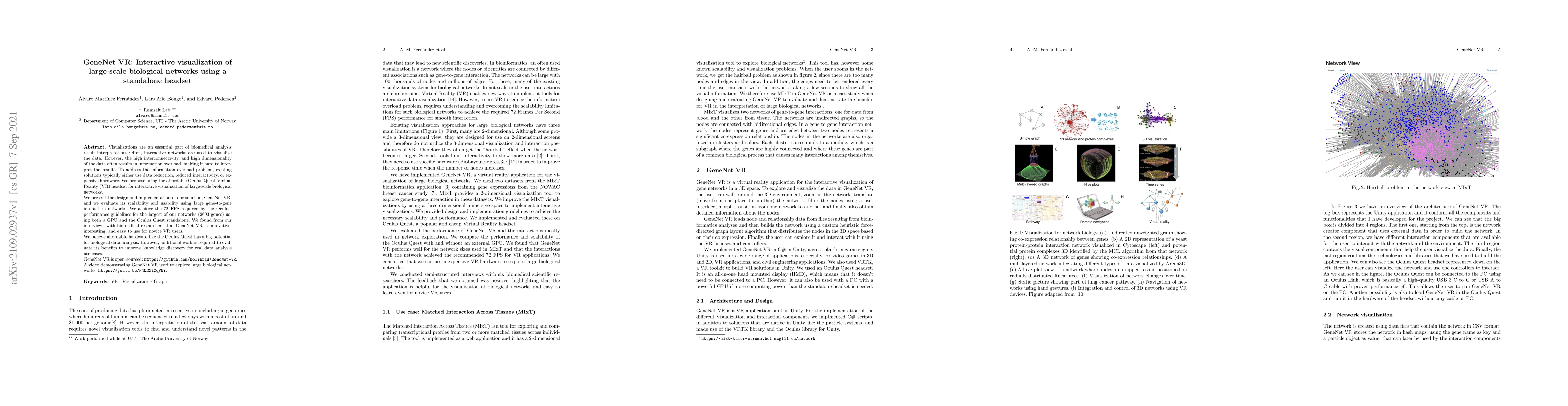 This paper introduces GeneNet VR, a solution using the affordable Oculus Quest VR headset for interactive visualization of large-scale biological networks. It achieves high frame rates and is found to be innovative, easy to use by novice VR users. The tool is open-sourced for potential benefits in biological data analysis, though further evaluation is needed.