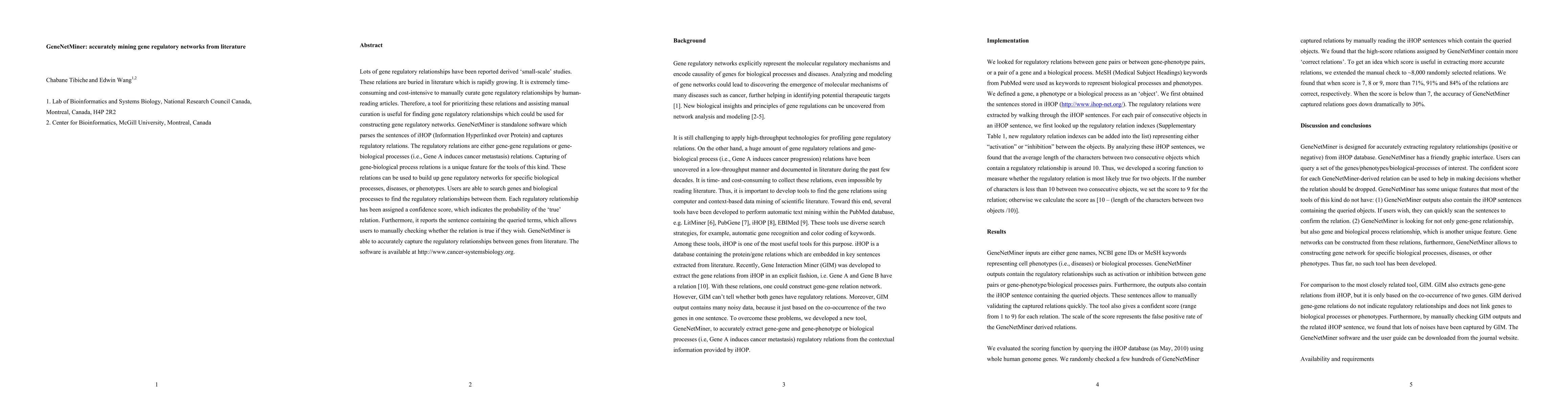 GeneNetMiner is a software tool that extracts gene regulatory and gene-biological process relations from literature, assigning confidence scores to each relationship and providing the original sentences for verification. It uniquely captures gene-biological process relations to build gene regulatory networks for specific biological contexts.