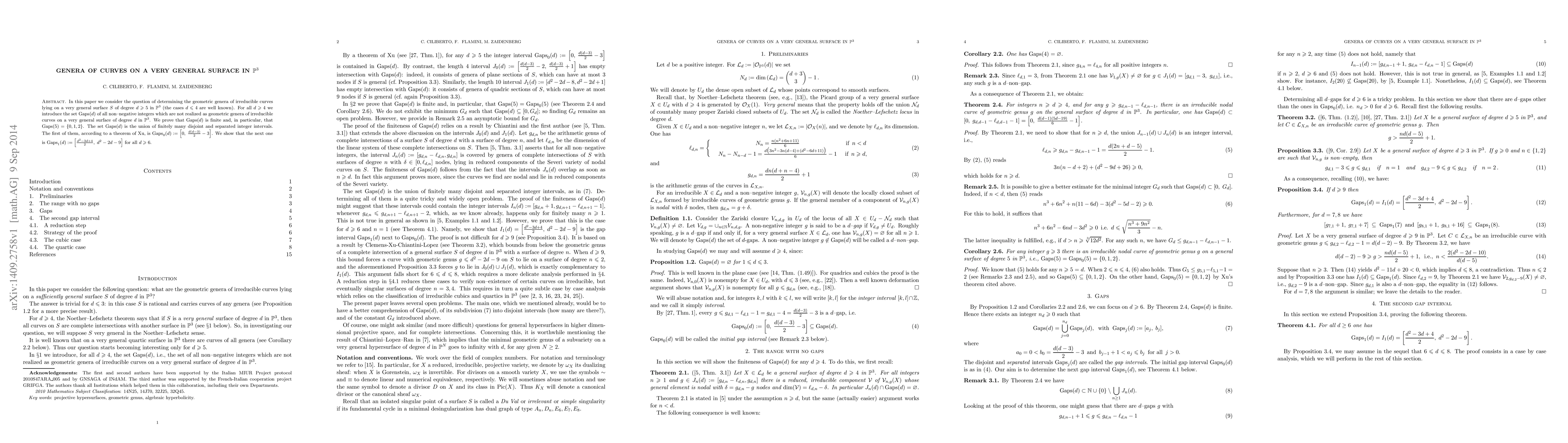 In this paper we consider the question of determining the geometric genera of irreducible curves lying on a very general surface $S$ of degree $d$ at least 5 in $\mathbb{P}^3$ (the cases $d \leqslant 4$ are well known). We introduce the set $Gaps(d)$ of all non-negative integers which are not realized as geometric genera of irreducible curves on $S$. We prove that $Gaps(d)$ is finite and, in particular, that $Gaps(5)= \{0,1,2\}$. The set $Gaps(d)$ is the union of finitely many disjoint and separated integer intervals. The first of them, according to a theorem of Xu, is $Gaps_0(d):=[0, \frac{d(d-3)}{2} - 3]$. We show that the next one is $Gaps_1(d):= [\frac{d^2-3d+4}{2}, d^2-2d-9]$ for all $d \geqslant 6$.