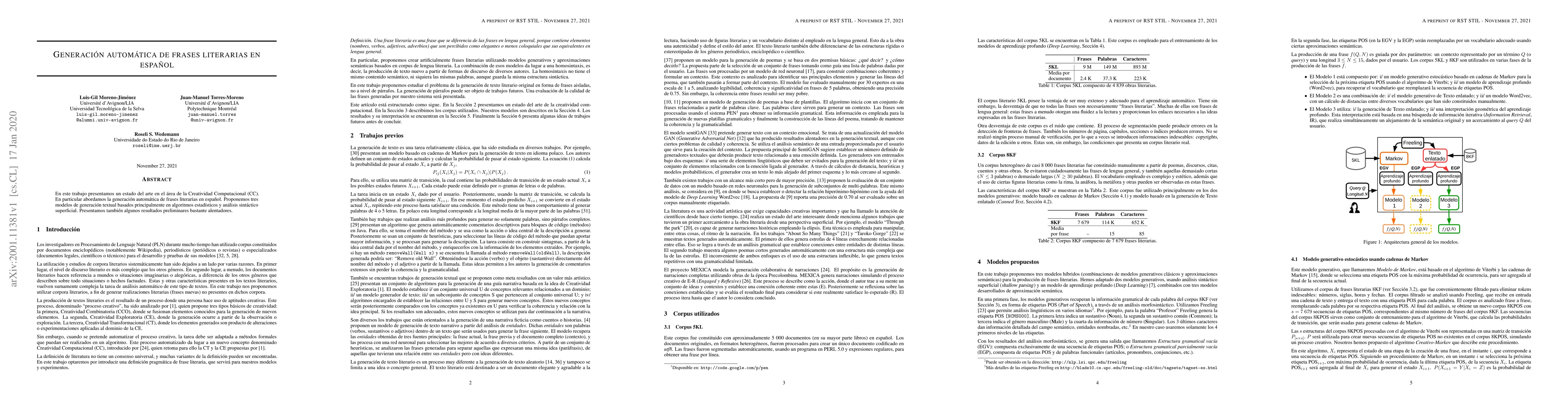 The research presents three models for automatic generation of literary sentences in Spanish, combining statistical algorithms, shallow parsing analysis, and deep learning techniques.