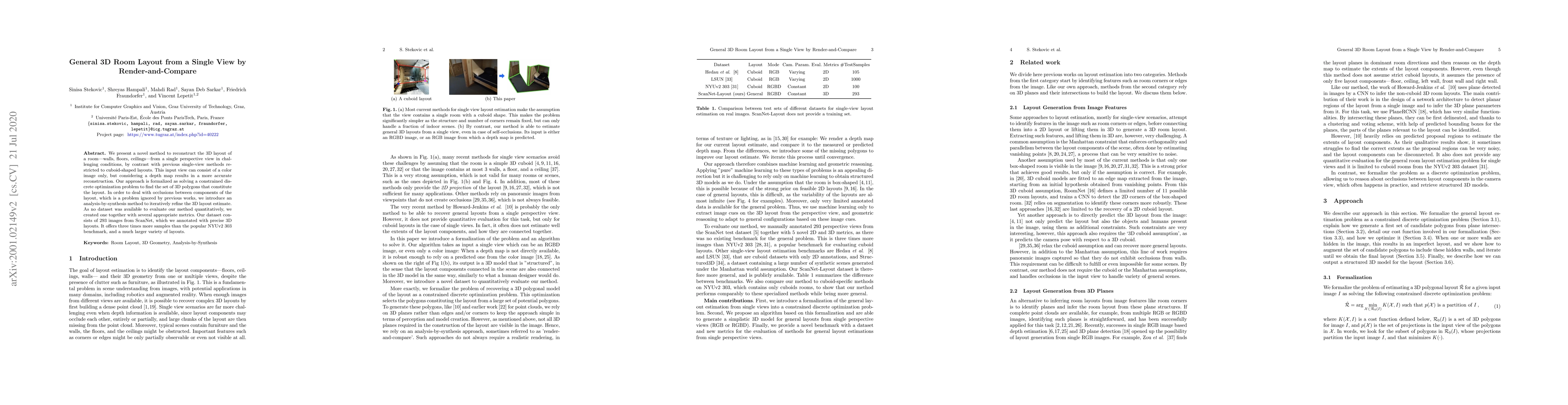 This paper introduces a novel method for reconstructing the 3D layout of rooms from a single perspective view, addressing non-cuboid layouts and occlusions. It employs a constrained optimization approach and an analysis-by-synthesis refinement technique, and it created a new dataset with 293 annotated images from ScanNet for evaluation.