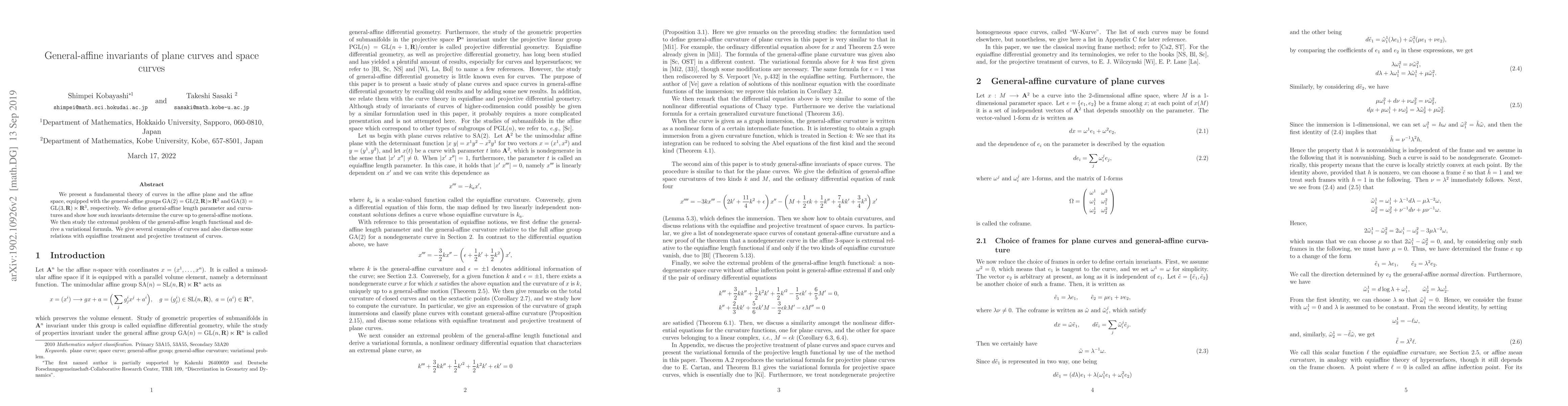 This paper develops a theory of general-affine invariants for plane and space curves, defining general-affine length parameters and curvatures that uniquely determine curves up to general-affine transformations. It also explores extremal problems and variational formulas related to these invariants, and discusses connections with equiaffine and projective treatments.