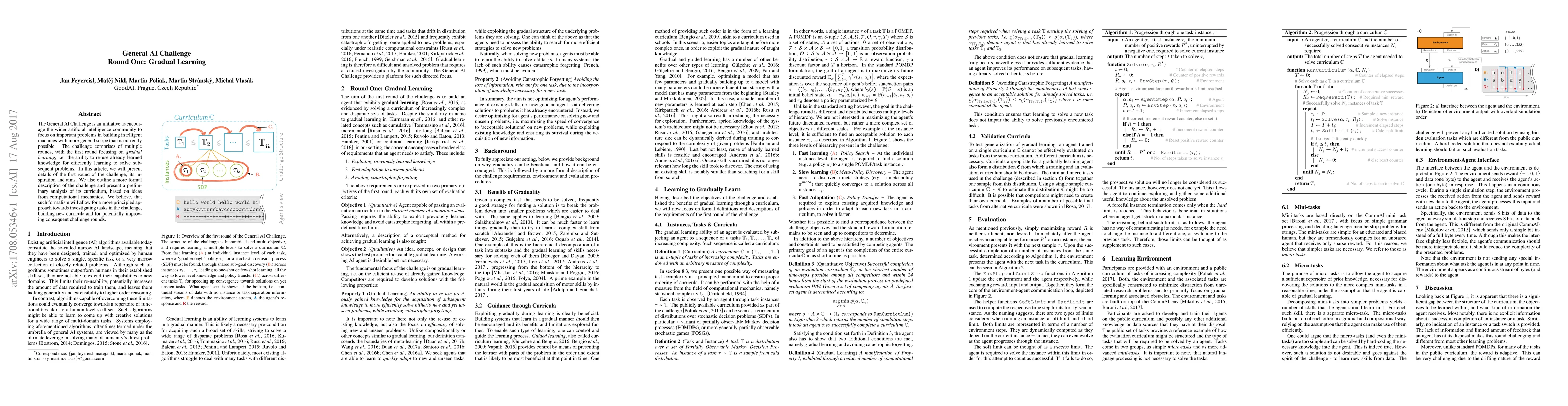 The General AI Challenge is an initiative to encourage the wider artificial intelligence community to focus on important problems in building intelligent machines with more general scope than is currently possible. The challenge comprises of multiple rounds, with the first round focusing on gradual learning, i.e. the ability to re-use already learned knowledge for efficiently learning to solve subsequent problems. In this article, we will present details of the first round of the challenge, its inspiration and aims. We also outline a more formal description of the challenge and present a preliminary analysis of its curriculum, based on ideas from computational mechanics. We believe, that such formalism will allow for a more principled approach towards investigating tasks in the challenge, building new curricula and for potentially improving consequent challenge rounds.