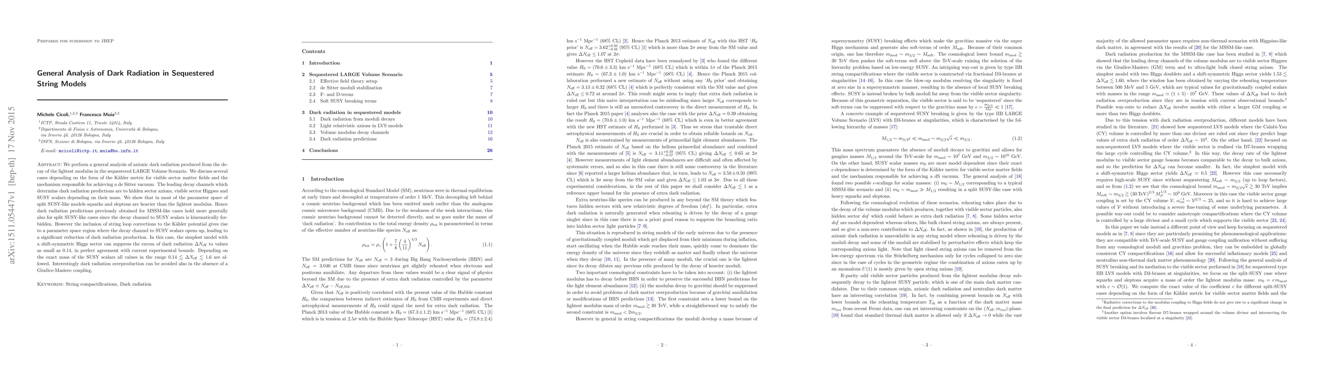 We perform a general analysis of axionic dark radiation produced from the decay of the lightest modulus in the sequestered LARGE Volume Scenario. We discuss several cases depending on the form of the Kahler metric for visible sector matter fields and the mechanism responsible for achieving a de Sitter vacuum. The leading decay channels which determine dark radiation predictions are to hidden sector axions, visible sector Higgses and SUSY scalars depending on their mass. We show that in most of the parameter space of split SUSY-like models squarks and sleptons are heavier than the lightest modulus. Hence dark radiation predictions previously obtained for MSSM-like cases hold more generally also for split SUSY-like cases since the decay channel to SUSY scalars is kinematically forbidden. However the inclusion of string loop corrections to the Kahler potential gives rise to a parameter space region where the decay channel to SUSY scalars opens up, leading to a significant reduction of dark radiation production. In this case, the simplest model with a shift-symmetric Higgs sector can suppress the excess of dark radiation $\Delta N_{eff}$ to values as small as 0.14, in perfect agreement with current experimental bounds. Depending on the exact mass of the SUSY scalars all values in the range 0.14 $\lesssim \Delta N_{eff} \lesssim$ 1.6 are allowed. Interestingly dark radiation overproduction can be avoided also in the absence of a Giudice-Masiero coupling.