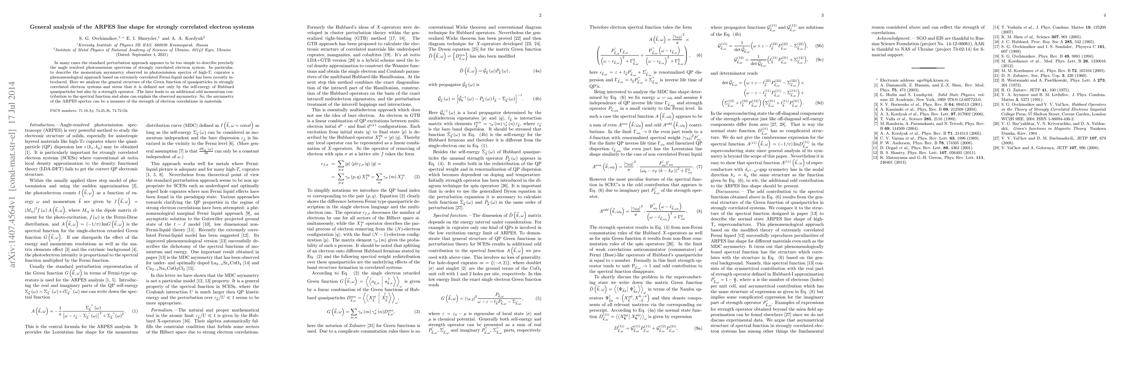 This paper analyzes the ARPES line shape for strongly correlated electron systems, demonstrating that the observed asymmetry in high-Tc cuprates cannot be explained by standard perturbation approaches alone. Instead, the authors propose that the asymmetry arises from a strength operator in the Green function, indicating the significance of electron correlations in these materials.
