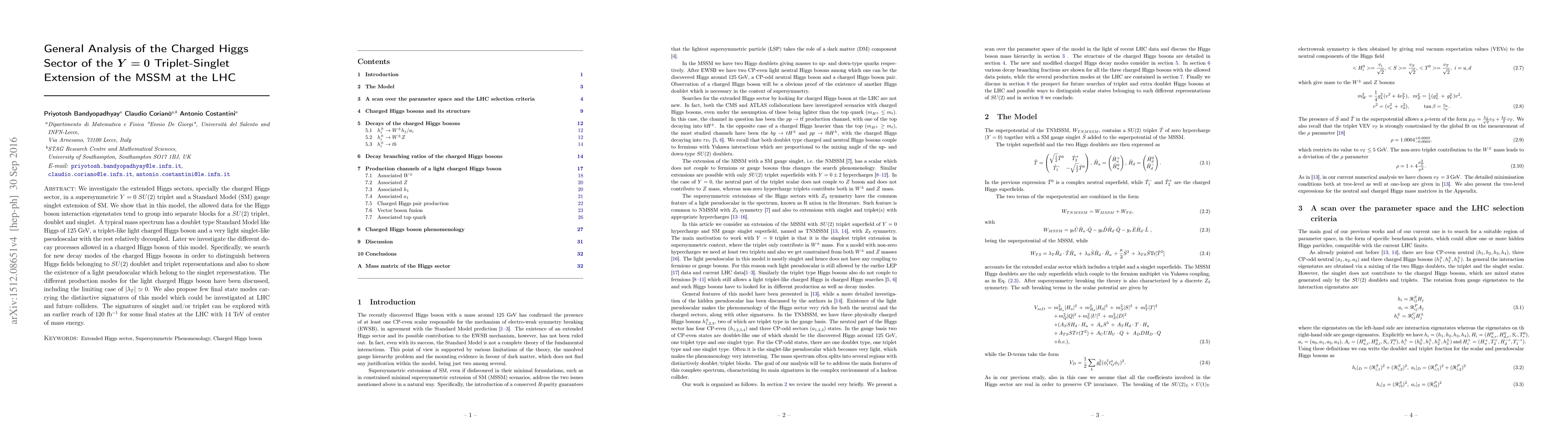 We investigate the extended Higgs sectors, specially the charged Higgs sector in a supersymmetric $Y=0$ $SU(2)$ triplet and a Standard Model (SM) gauge singlet extension of SM. We show that in this model the allowed data for the Higgs boson interaction eigenstates tend to group into separate blocks for $SU(2)$ triplet, doublet and singlet. The triplet sector has two degenerate paired states, each pair composed of a mostly-triplet charged Higgs and of a mostly-triplet scalar or pseudoscalar state. The mostly-doublet sector involves a Standard Model like Higgs of 125 GeV and extra mass-degenerate states, composed of a charged, a scalar and a pseudoscalar. The CP-odd component of the singlet scalar, after supersymmetry breaking, takes the role of a pseudo-Nambu-Goldstone mode in the $Z_3$ symmetric case, while the CP-even one becomes decoupled. In a second part of our study we investigate the different decay processes allowed to a charged Higgs boson of this model. Specifically, we search for general signatures of the TNMSSM in order to distinguish among Higgs fields belonging to $SU(2)$ doublet, triplet and singlet representations at the LHC. We also propose few golden plated final state modes carrying the distinctive signatures of this model which could be investigated in collider searches. We also show how in the decoupling limit of the triplet ($|\lambda_T| \simeq 0$) affects the decays as well as the production channels at the LHC.