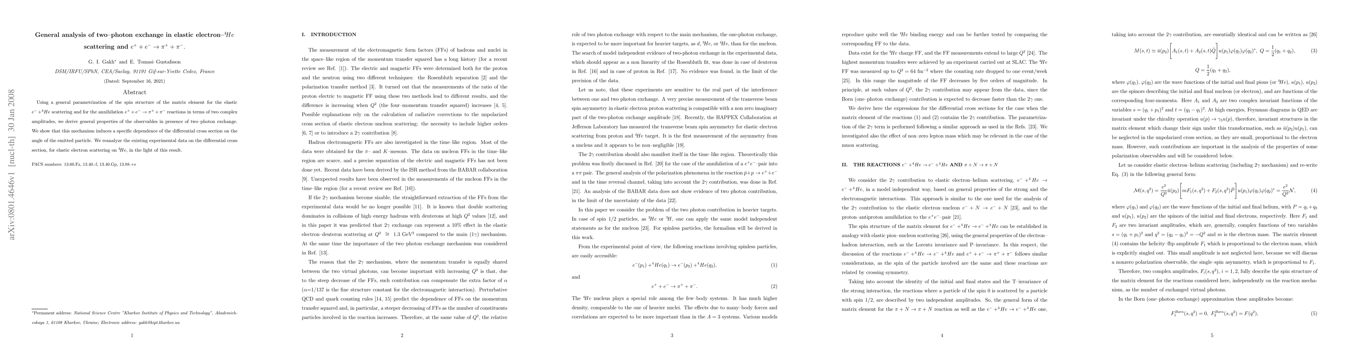 Using a general parametrization of the spin structure of the matrix element for the elastic $e^-+^4He$ scattering and for the annihilation $e^++e^-\to \pi^++\pi^-$ reactions in terms of two complex amplitudes, we derive general properties of the observables in presence of two--photon exchange. We show that this mechanism induces a specific dependence of the differential cross section on the angle of the emitted particle. We reanalyze the existing experimental data on the differential cross section, for elastic electron scattering on $^4He$, in the light of this result.