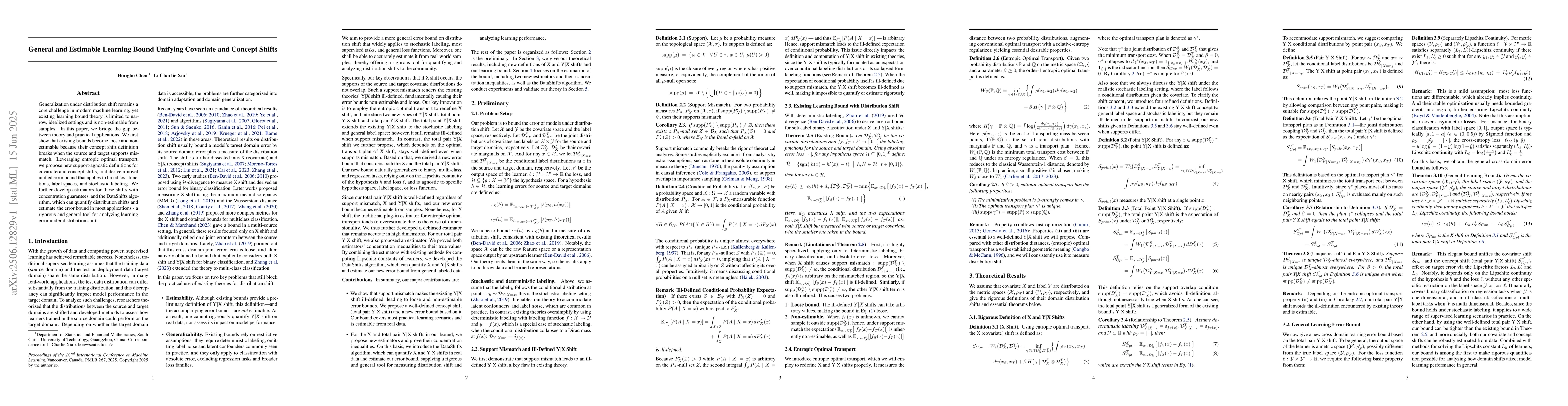 Generalization under distribution shift remains a core challenge in modern machine learning, yet existing learning bound theory is limited to narrow, idealized settings and is non-estimable from samples. In this paper, we bridge the gap between theory and practical applications. We first show that existing bounds become loose and non-estimable because their concept shift definition breaks when the source and target supports mismatch. Leveraging entropic optimal transport, we propose new support-agnostic definitions for covariate and concept shifts, and derive a novel unified error bound that applies to broad loss functions, label spaces, and stochastic labeling. We further develop estimators for these shifts with concentration guarantees, and the DataShifts algorithm, which can quantify distribution shifts and estimate the error bound in most applications -- a rigorous and general tool for analyzing learning error under distribution shift.