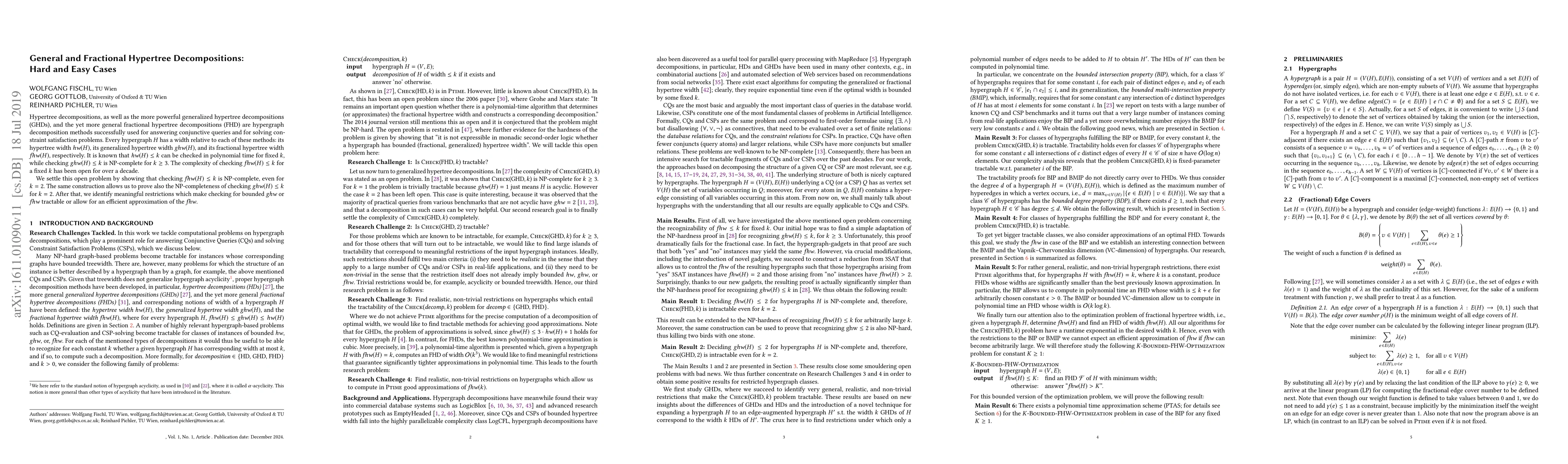 This paper investigates the complexity of determining the width of hypergraphs relative to hypertree, generalized hypertree, and fractional hypertree decompositions. It establishes the NP-completeness of checking fractional hypertree width for even small bounds, and similarly for generalized hypertree width, while identifying specific restrictions under which these problems become tractable.