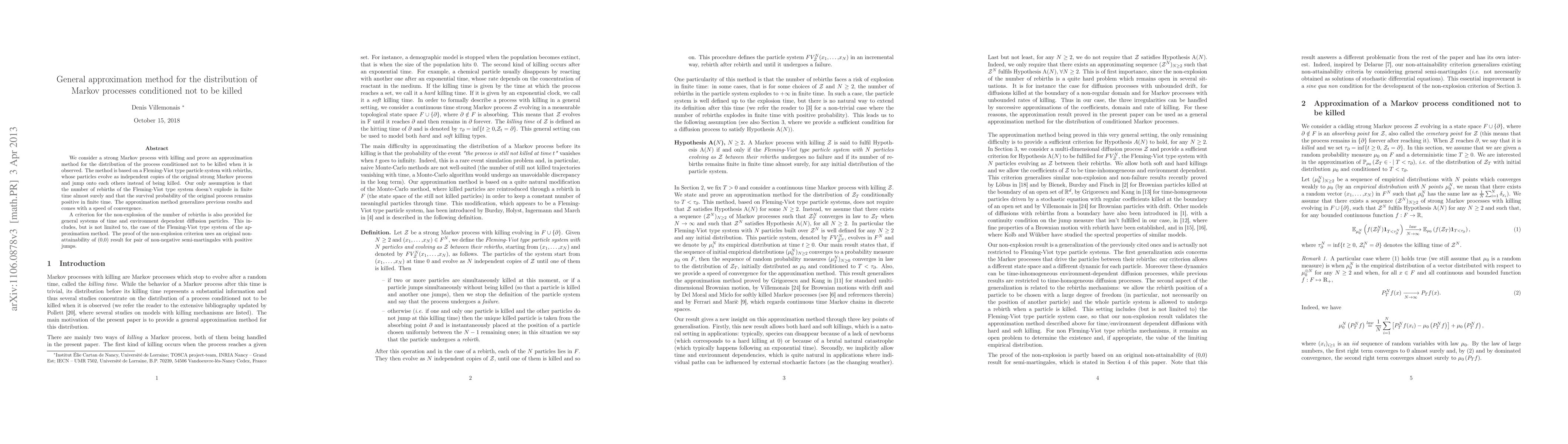 This paper develops an approximation method for the distribution of a strong Markov process conditioned on its survival, using a Fleming-Viot type particle system with rebirths. The method generalizes previous results and provides a criterion for non-explosion of rebirths, supported by a novel non-attainability result for semi-martingales.