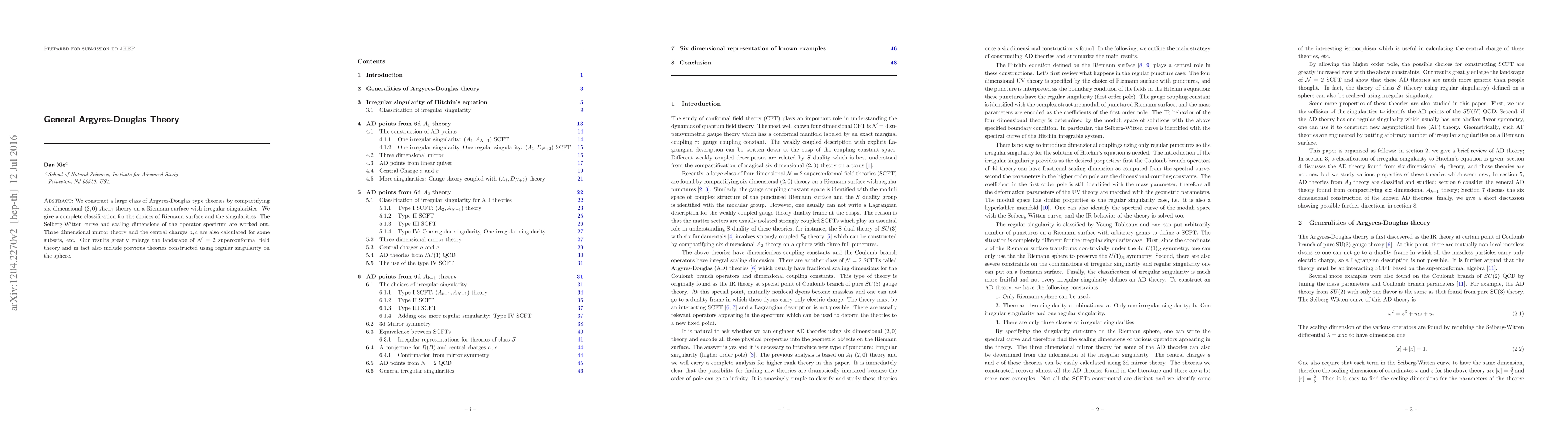 This paper constructs and classifies a wide range of Argyres-Douglas theories by compactifying six-dimensional (2,0) A_N theory on Riemann surfaces with irregular singularities, providing detailed calculations of Seiberg-Witten curves, scaling dimensions, and central charges. The findings significantly expand the scope of N=2 superconformal field theories.