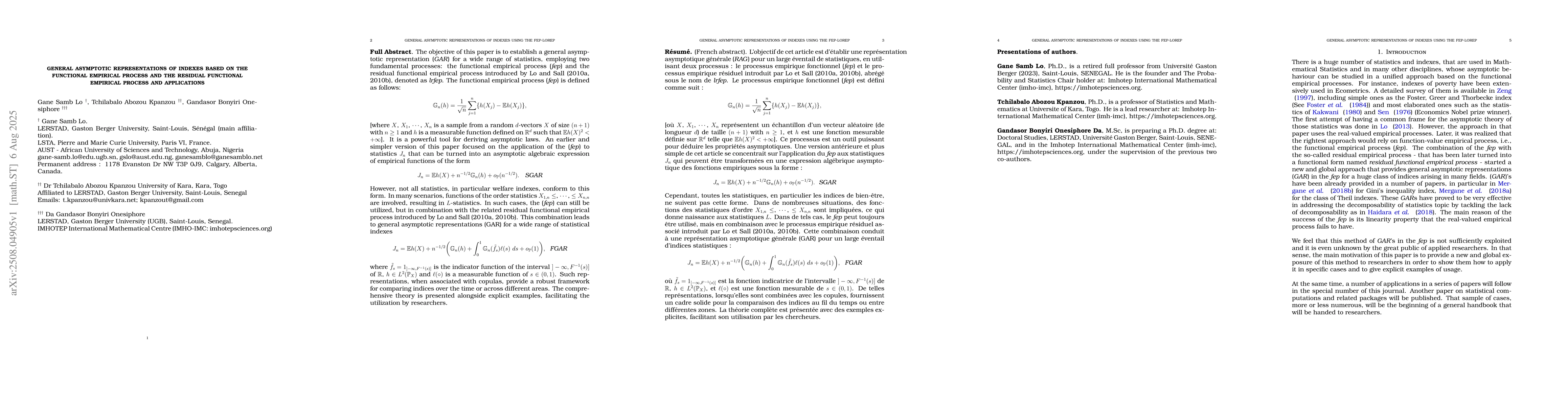 The objective of this paper is to establish a general asymptotic representation (\textit{GAR}) for a wide range of statistics, employing two fundamental processes: the functional empirical process (\textit{fep}) and the residual functional empirical process introduced by Lo and Sall (2010a, 2010b), denoted as \textit{lrfep}. The functional empirical process (\textit{fep}) is defined as follows: $$ \mathbb{G}_n(h)=\frac{1}{\sqrt{n}} \sum_{j=1}^{n} \{h(X_j)-\mathbb{E}h(X_j)\}, $$ \Bin [where $X$, $X_1$, $\cdots$, $X_n$ is a sample from a random $d$-vectors $X$ of size $(n+1)$ with $n\geq 1$ and $h$ is a measurable function defined on $\mathbb{R}^d$ such that $\mathbb{E}h(X)^2<+\infty$]. It is a powerful tool for deriving asymptotic laws. An earlier and simpler version of this paper focused on the application of the (\textit{fep}) to statistics $J_n$ that can be turned into an asymptotic algebraic expression of empirical functions of the form $$ J_n=\mathbb{E}h(X) + n^{-1/2} \mathbb{G}_n(h) + o_{\mathbb{P}}(n^{-1/2}). \ \ \ \textit{SGAR} $$ \Bin However, not all statistics, in particular welfare indexes, conform to this form. In many scenarios, functions of the order statistics $X_{1,n}\leq$, $\cdots$, $\leq X_{n,n}$ are involved, resulting in $L$-statistics. In such cases, the (\textit{fep}) can still be utilized, but in combination with the related residual functional empirical process introduced by Lo and Sall (2010a, 2010b). This combination leads to general asymptotic representations (GAR) for a wide range of statistical indexes $$ J_n=\mathbb{E}h(X) + n^{-1/2} \biggr(\mathbb{G}_n(h) + \int_{0}^{1} \mathbb{G}_n(\tilde{f}_s) \ell(s) \ ds + o_{\mathbb{P}}(1)\biggr), \ \ \textit{FGAR} $$