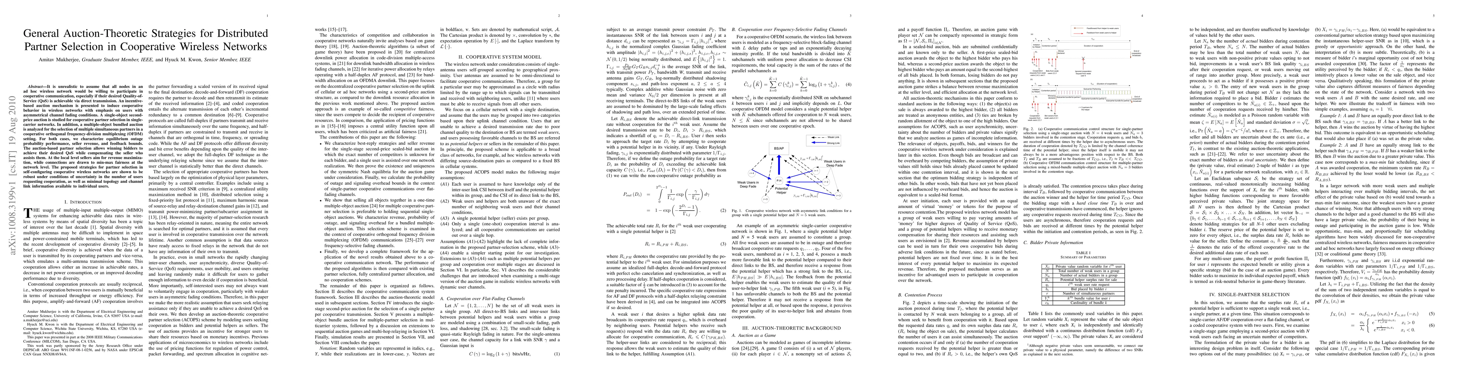 This paper presents auction-theoretic strategies for selecting cooperative partners in wireless networks, focusing on incentive-based mechanisms to encourage participation. It analyzes single-object and multiple-object auctions for partner selection in single-carrier and OFDM settings, respectively, and evaluates their performance, revenue, and fairness.