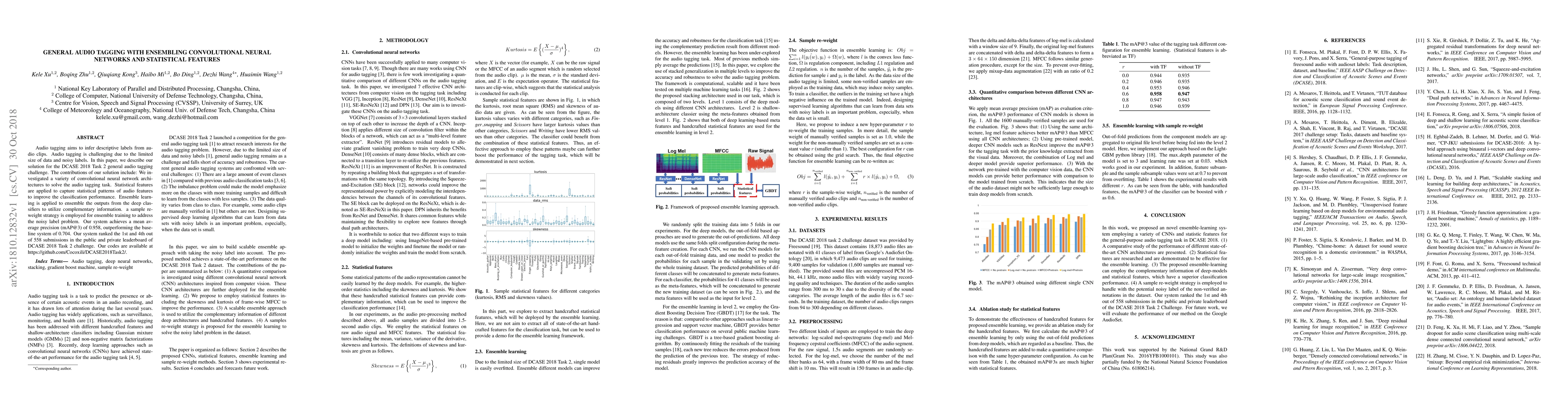 This paper proposes an ensembling approach combining convolutional neural networks and statistical features for general audio tagging, achieving a mean average precision of 0.958. The system ranks first in the DCASE 2018 Task 2 challenge, outperforming baselines and employing a re-weight strategy to mitigate noisy labels.
