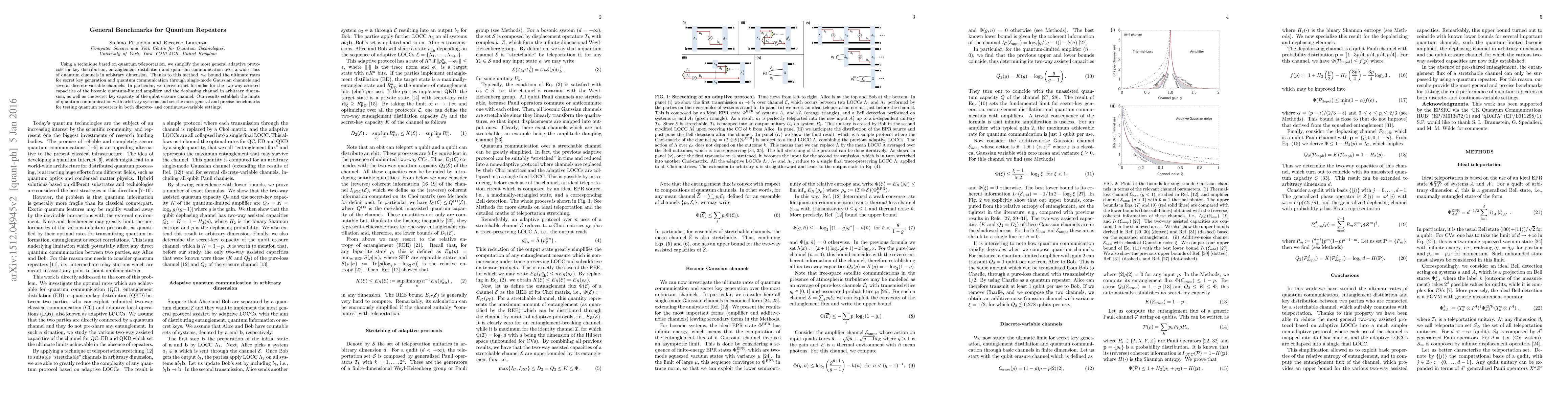 This paper establishes general benchmarks for quantum repeaters by simplifying adaptive protocols for key distribution and quantum communication using quantum teleportation. It provides exact formulas for capacities in various channels, setting precise limits for testing quantum repeaters in both discrete- and continuous-variable systems.