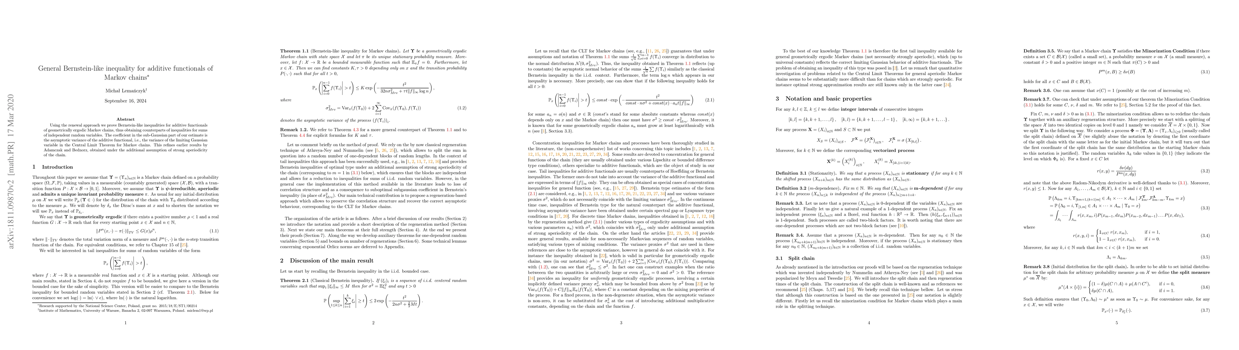 This paper proves Bernstein-like inequalities for additive functionals of geometrically ergodic Markov chains using a renewal approach, refining earlier results by Adamczak and Bednorz by removing the strong aperiodicity assumption. The coefficient in the sub-Gaussian part of the estimate is the asymptotic variance of the additive functional.