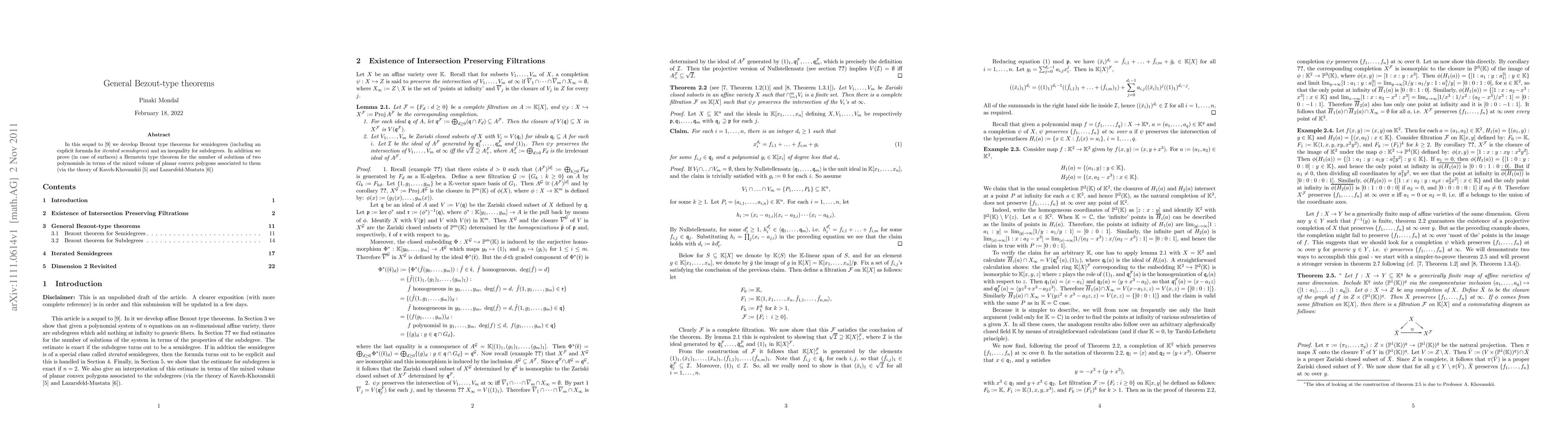 The paper develops Bezout-type theorems for semidegrees, including an explicit formula for iterated semidegrees, and proves an inequality for subdegrees. It also establishes a Bernstein-type theorem for the number of solutions of two polynomials in terms of the mixed volume of planar convex polygons.