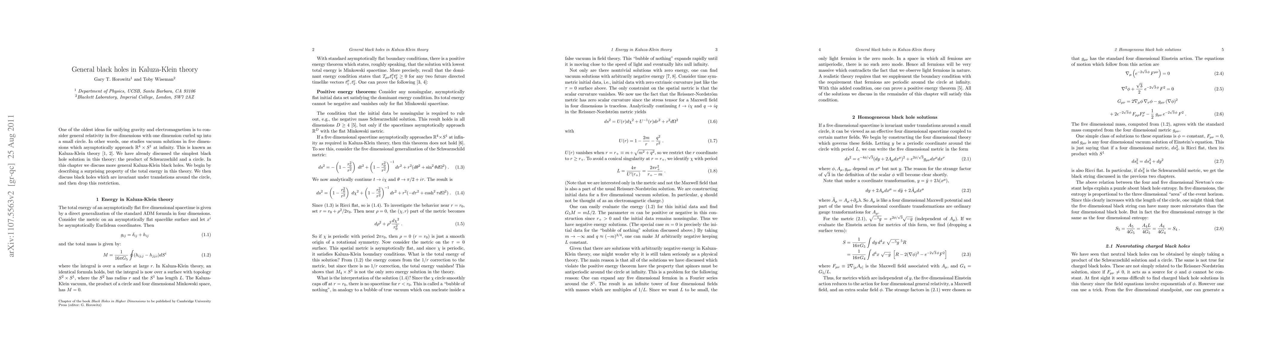 A combination of analytical and numerical methods were used to study the properties of Kaluza-Klein black holes.
