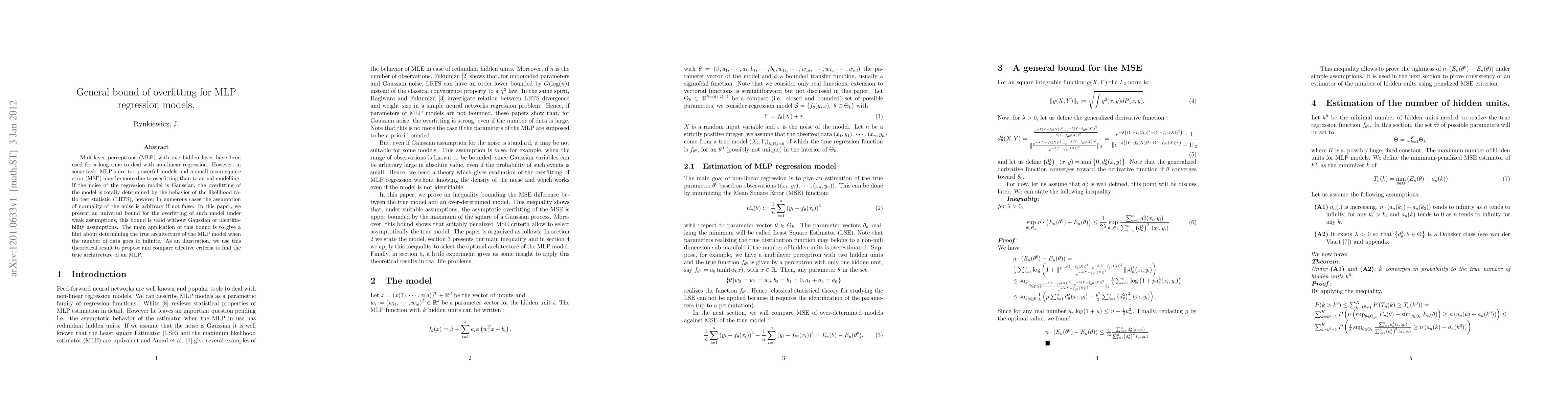 Researchers developed an universal bound for overfitting in Multilayer Perceptrons (MLP) regression models under weak assumptions, providing a new approach to determine the true architecture of MLPs.