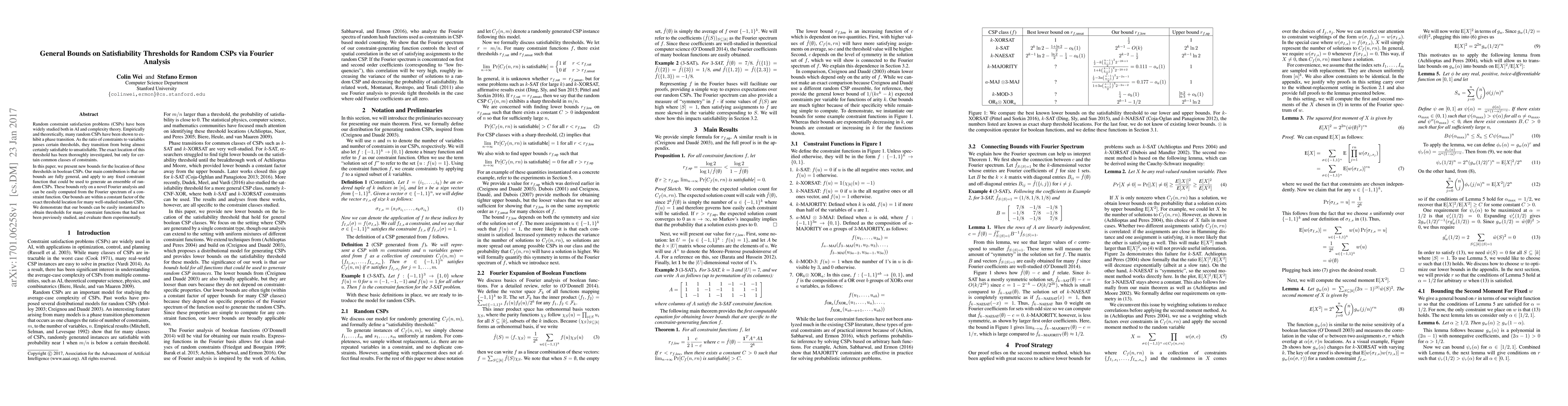 This paper presents new general bounds for the satisfiability thresholds in random boolean constraint satisfaction problems (CSPs) using Fourier analysis. The bounds apply universally to any fixed constraint function and are within a constant factor of the exact threshold for many studied CSPs.
