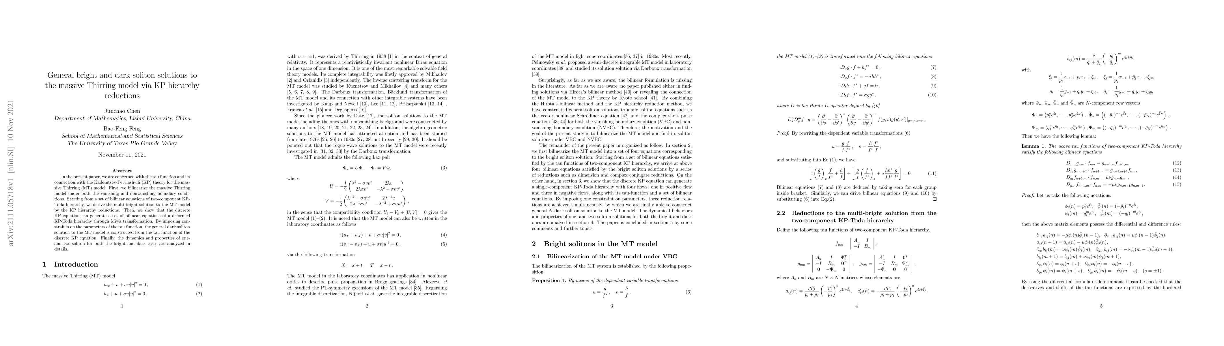 This paper investigates soliton solutions for the massive Thirring model using KP hierarchy reductions, deriving multi-bright and general dark soliton solutions via bilinear equations from the KP-Toda hierarchy and Miwa transformation, and analyzing their dynamics.