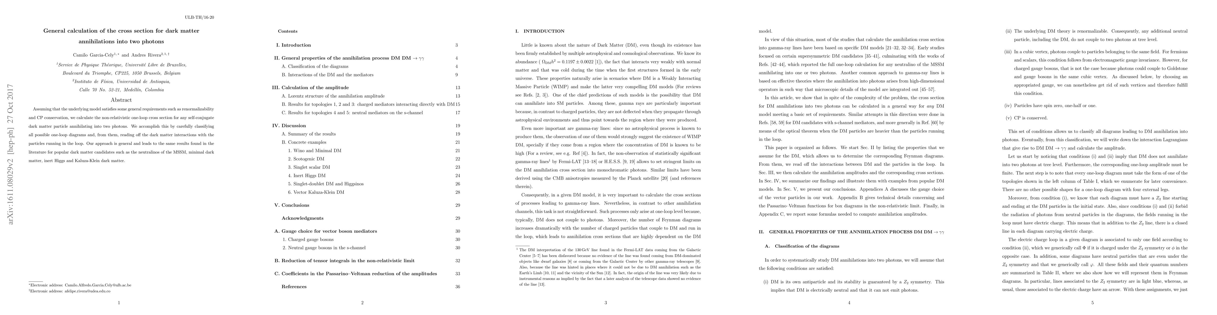 Assuming that the underlying model satisfies some general requirements such as renormalizability and CP conservation, we calculate the non-relativistic one-loop cross section for any self-conjugate dark matter particle annihilating into two photons. We accomplish this by carefully classifying all possible one-loop diagrams and, from them, reading off the dark matter interactions with the particles running in the loop. Our approach is general and leads to the same results found in the literature for popular dark matter candidates such as the neutralinos of the MSSM, minimal dark matter, inert Higgs and Kaluza-Klein dark matter.