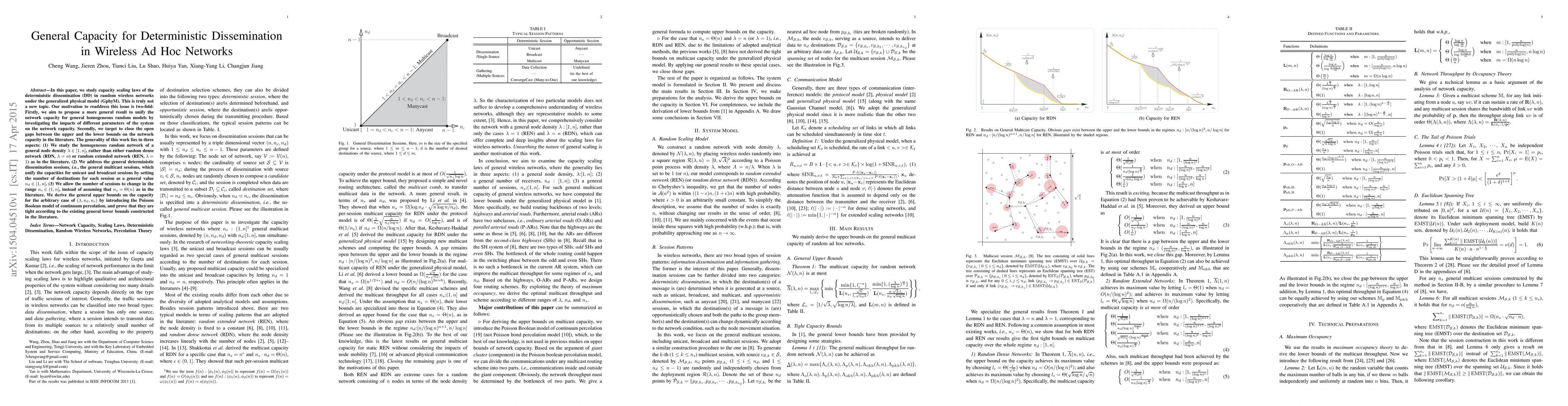 The paper derives general upper bounds on deterministic dissemination capacity in wireless ad hoc networks using the generalized physical model (GphyM). It considers homogeneous random networks with node density λ ∈ [1, n], general multicast sessions with destination number n_d ∈ [1, n], and allows for an arbitrary number of sessions n_s ∈ (1, n).