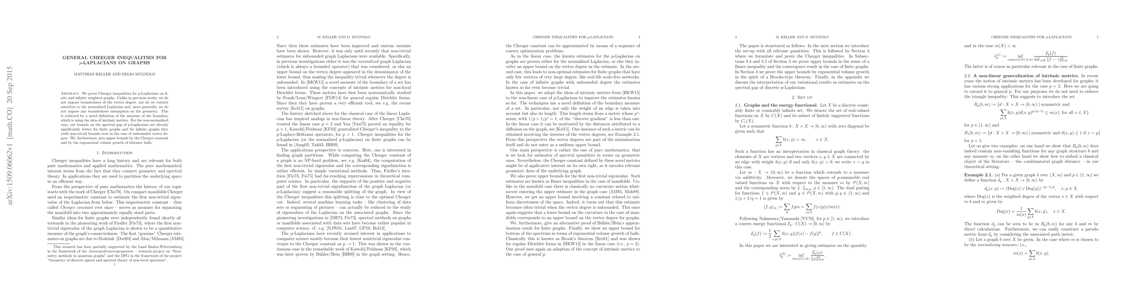 We prove Cheeger inequalities for p-Laplacians on finite and infinite weighted graphs. Unlike in previous works, we do not impose boundedness of the vertex degree, nor do we restrict ourselves to the normalized Laplacian and, more generally, we do not impose any boundedness assumption on the geometry. This is achieved by a novel definition of the measure of the boundary which is using the idea of intrinsic metrics. For the non-normalized case, our bounds on the spectral gap of p-Laplacians are already significantly better for finite graphs and for infinite graphs they yield non-trivial bounds even in the case of unbounded vertex degree. We, furthermore, give upper bounds by the Cheeger constant and by the exponential volume growth of distance balls.