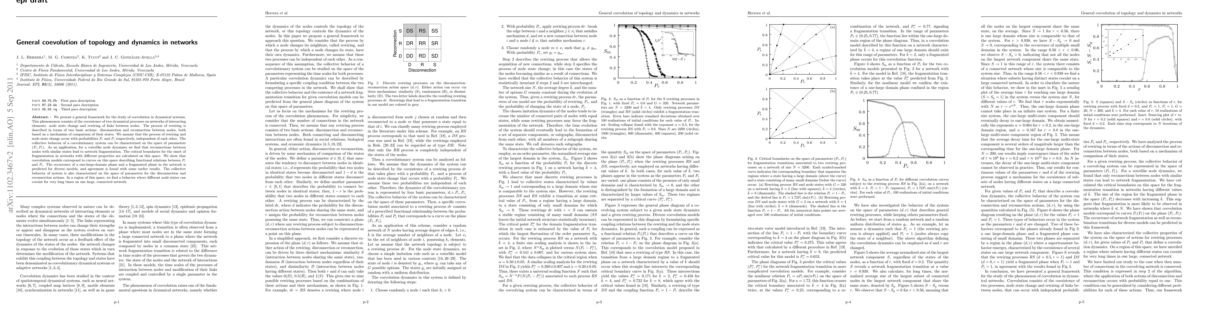 We present a general framework for the study of coevolution in dynamical systems. This phenomenon consists of the coexistence of two dynamical processes on networks of interacting elements: node state change and rewiring of links between nodes. The process of rewiring is described in terms of two basic actions: disconnection and reconnection between nodes, both based on a mechanism of comparison of their states. We assume that the process of rewiring and node state change occur with probabilities Pr and Pc respectively, independent of each other. The collective behavior of a coevolutionary system can be characterized on the space of parameters (Pr, Pc). As an application, for a voterlike node dynamics we find that reconnections between nodes with similar states lead to network fragmentation. The critical boundaries for the onset of fragmentation in networks with different properties are calculated on this space. We show that coevolution models correspond to curves on this space describing functional relations between Pr and Pc. The occurrence of a one-large-domain phase and a fragmented phase in the network is predicted for diverse models, and agreement is found with some earlier results. The collective behavior of system is also characterized on the space of parameters for the disconnection and reconnection actions. In a region of this space, we find a behavior where different node states can coexist for very long times on one large, connected network.