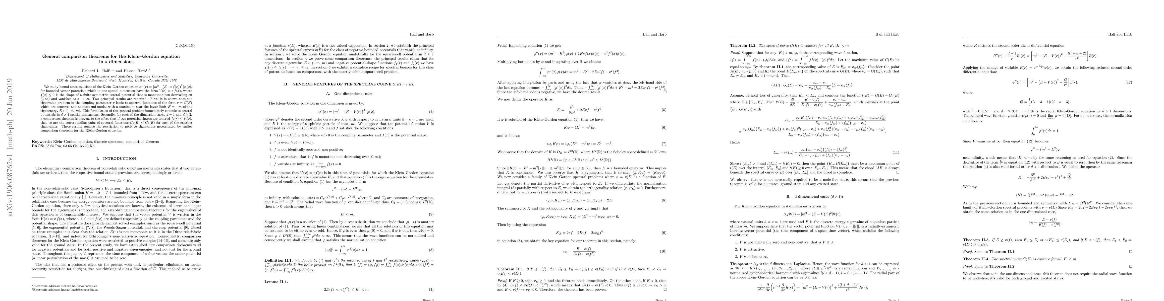 We study bound-state solutions of the Klein-Gordon equation $\varphi^{\prime\prime}(x) =\big[m^2-\big(E-v\,f(x)\big)^2\big] \varphi(x),$ for bounded vector potentials which in one spatial dimension have the form $V(x) = v\,f(x),$ where $f(x)\le 0$ is the shape of a finite symmetric central potential that is monotone non-decreasing on $[0, \infty)$ and vanishes as $x\rightarrow\infty.$ Two principal results are reported. First, it is shown that the eigenvalue problem in the coupling parameter $v$ leads to spectral functions of the form $v= G(E)$ which are concave, and at most uni-modal with a maximum near the lower limit $E = -m$ of the eigenenergy $E \in (-m, \, m)$. This formulation of the spectral problem immediately extends to central potentials in $d > 1$ spatial dimensions. Secondly, for each of the dimension cases, $d=1$ and $d \ge 2$, a comparison theorem is proven, to the effect that if two potential shapes are ordered $f_1(r) \leq f_2(r),$ then so are the corresponding pairs of spectral functions $G_1(E) \leq G_2(E)$ for each of the existing eigenvalues. These results remove the restriction to positive eigenvalues necessitated by earlier comparison theorems for the Klein--Gordon equation.