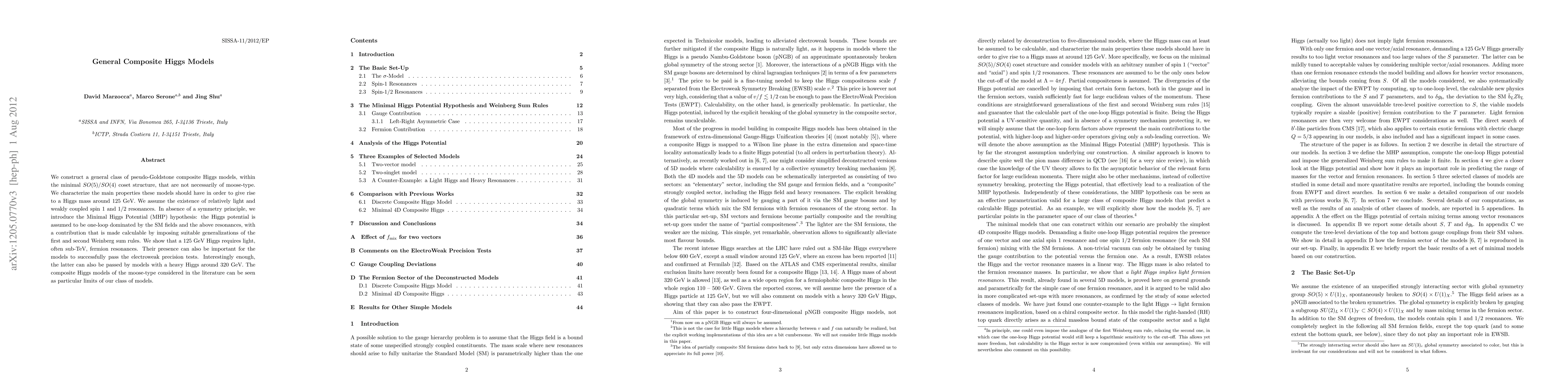 We construct a general class of pseudo-Goldstone composite Higgs models, within the minimal SO(5)/SO(4) coset structure, that are not necessarily of moose-type. We characterize the main properties these models should have in order to give rise to a Higgs mass around 125 GeV. We assume the existence of relatively light and weakly coupled spin 1 and 1/2 resonances. In absence of a symmetry principle, we introduce the Minimal Higgs Potential (MHP) hypothesis: the Higgs potential is assumed to be one-loop dominated by the SM fields and the above resonances, with a contribution that is made calculable by imposing suitable generalizations of the first and second Weinberg sum rules. We show that a 125 GeV Higgs requires light, often sub-TeV, fermion resonances. Their presence can also be important for the models to successfully pass the electroweak precision tests. Interestingly enough, the latter can also be passed by models with a heavy Higgs around 320 GeV. The composite Higgs models of the moose-type considered in the literature can be seen as particular limits of our class of models.