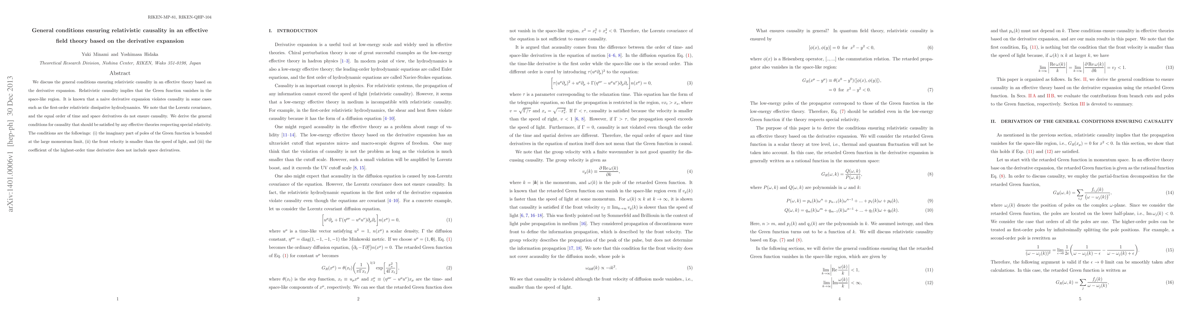 We discuss the general conditions ensuring relativistic causality in an effective theory based on the derivative expansion. Relativistic causality implies that the Green function vanishes in the space-like region. It is known that a naive derivative expansion violates causality in some cases such as the first-order relativistic dissipative hydrodynamics. We note that the Lorentz covariance, and the equal order of time and space derivatives do not ensure causality. We derive the general conditions for causality that should be satisfied by any effective theories respecting special relativity. The conditions are the followings: (i) the imaginary part of poles of the Green function is bounded at the large momentum limit, (ii) the front velocity is smaller than the speed of light, and (iii) the coefficient of the highest-order time derivative does not include space derivatives.