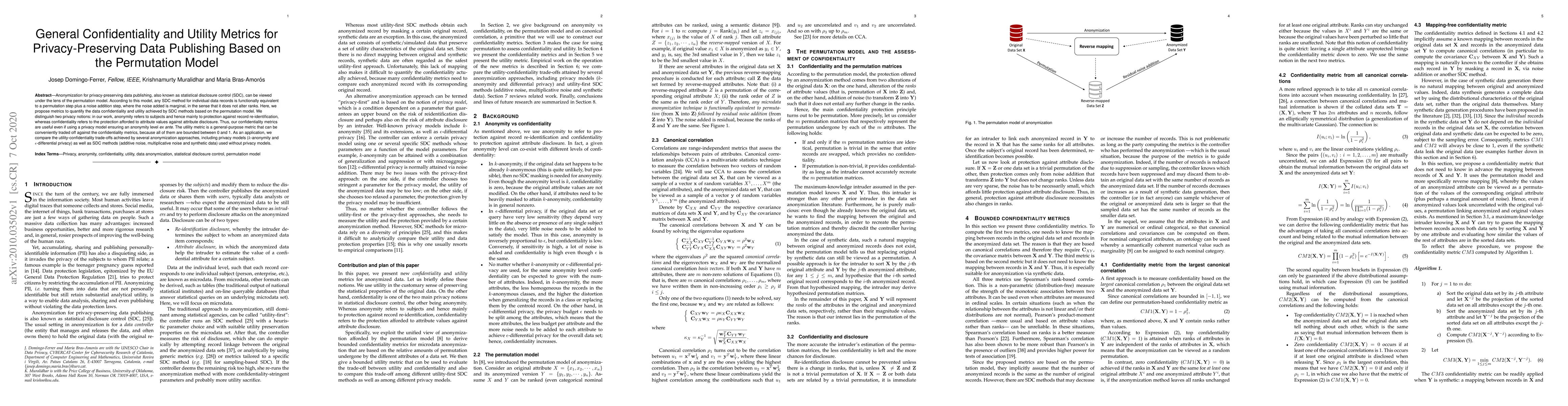Anonymization for privacy-preserving data publishing, also known as statistical disclosure control (SDC), can be viewed under the lens of the permutation model. According to this model, any SDC method for individual data records is functionally equivalent to a permutation step plus a noise addition step, where the noise added is marginal, in the sense that it does not alter ranks. Here, we propose metrics to quantify the data confidentiality and utility achieved by SDC methods based on the permutation model. We distinguish two privacy notions: in our work, anonymity refers to subjects and hence mainly to protection against record re-identification, whereas confidentiality refers to the protection afforded to attribute values against attribute disclosure. Thus, our confidentiality metrics are useful even if using a privacy model ensuring an anonymity level ex ante. The utility metric is a general-purpose metric that can be conveniently traded off against the confidentiality metrics, because all of them are bounded between 0 and 1. As an application, we compare the utility-confidentiality trade-offs achieved by several anonymization approaches, including privacy models (k-anonymity and $\epsilon$-differential privacy) as well as SDC methods (additive noise, multiplicative noise and synthetic data) used without privacy models.