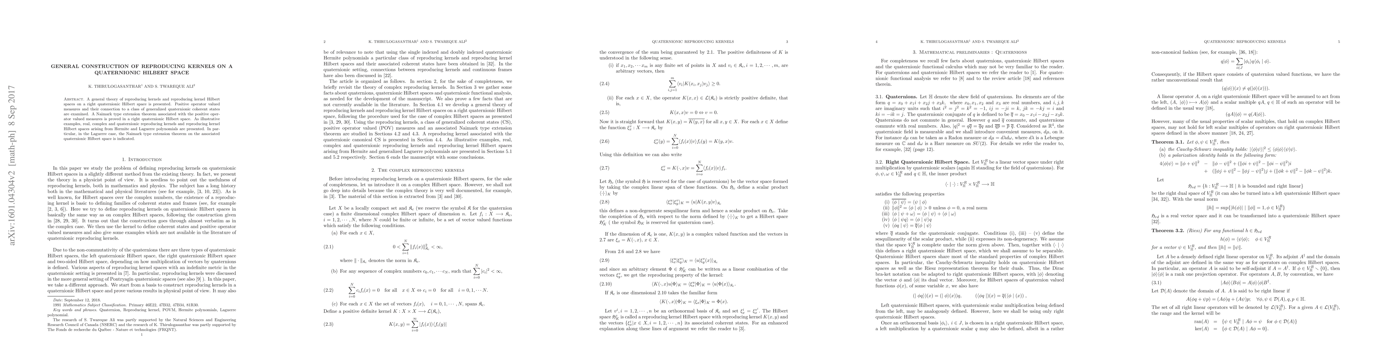 This paper develops a general theory for reproducing kernels and reproducing kernel Hilbert spaces in right quaternionic Hilbert spaces, proving a Naimark type extension theorem linked to positive operator valued measures. Examples include real, complex, and quaternionic reproducing kernels derived from Hermite and Laguerre polynomials.