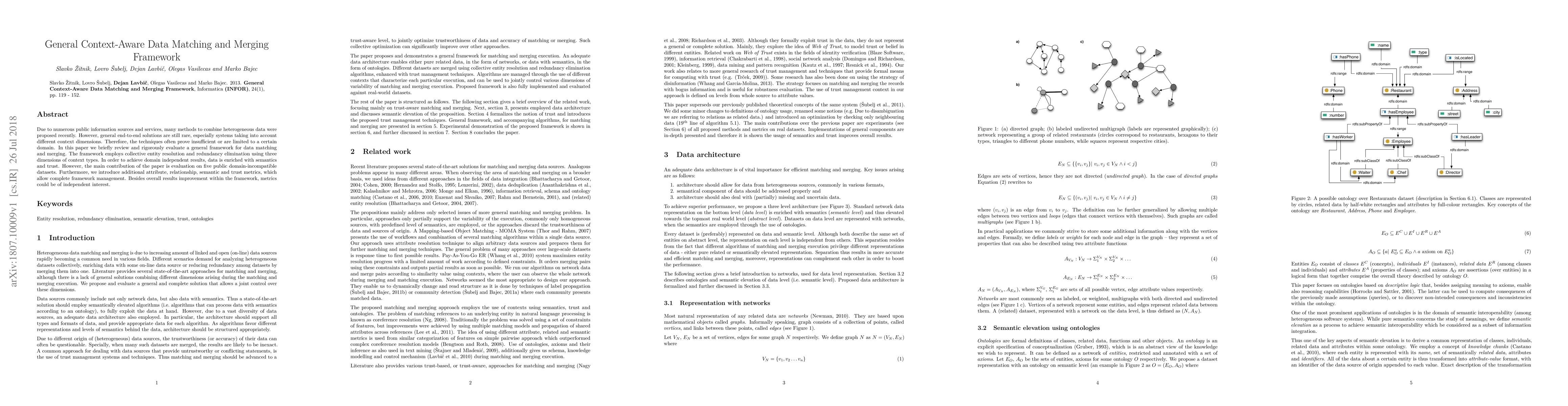 This paper presents a general framework for context-aware data matching and merging, employing collective entity resolution and redundancy elimination across three context dimensions. The main contribution is the rigorous evaluation on five domain-incompatible datasets, along with new metrics for attribute, relationship, semantic, and trust, enhancing framework management.