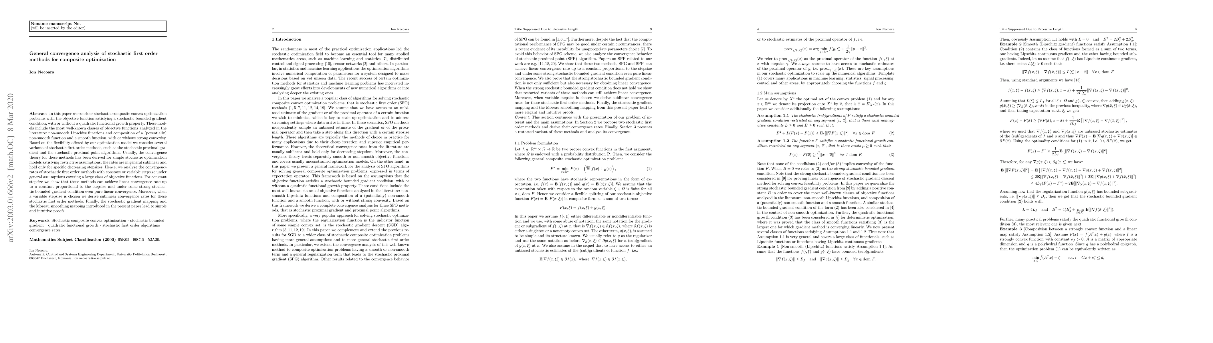 In this paper we consider stochastic composite convex optimization problems with the objective function satisfying a stochastic bounded gradient condition, with or without a quadratic functional growth property. These models include the most well-known classes of objective functions analyzed in the literature: non-smooth Lipschitz functions and composition of a (potentially) non-smooth function and a smooth function, with or without strong convexity. Based on the flexibility offered by our optimization model we consider several variants of stochastic first order methods, such as the stochastic proximal gradient and the stochastic proximal point algorithms. Usually, the convergence theory for these methods has been derived for simple stochastic optimization models satisfying restrictive assumptions, the rates are in general sublinear and hold only for specific decreasing stepsizes. Hence, we analyze the convergence rates of stochastic first order methods with constant or variable stepsize under general assumptions covering a large class of objective functions. For constant stepsize we show that these methods can achieve linear convergence rate up to a constant proportional to the stepsize and under some strong stochastic bounded gradient condition even pure linear convergence. Moreover, when a variable stepsize is chosen we derive sublinear convergence rates for these stochastic first order methods. Finally, the stochastic gradient mapping and the Moreau smoothing mapping introduced in the present paper lead to simple and intuitive proofs.