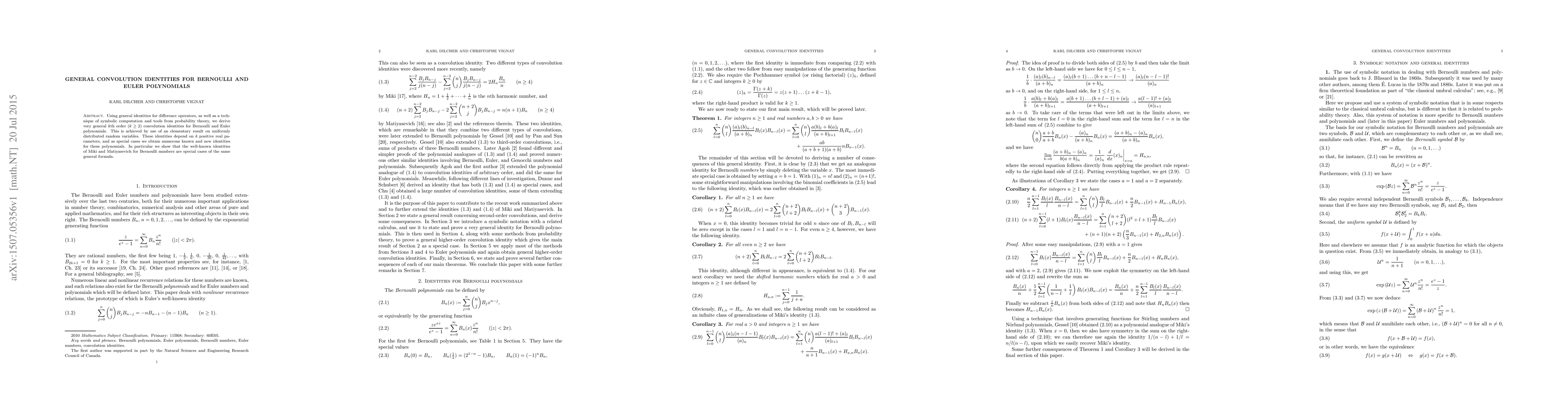 The paper derives general kth-order convolution identities for Bernoulli and Euler polynomials using difference operators and symbolic computation, showcasing that well-known identities are special cases of the proposed general formula. These identities depend on k positive real parameters.