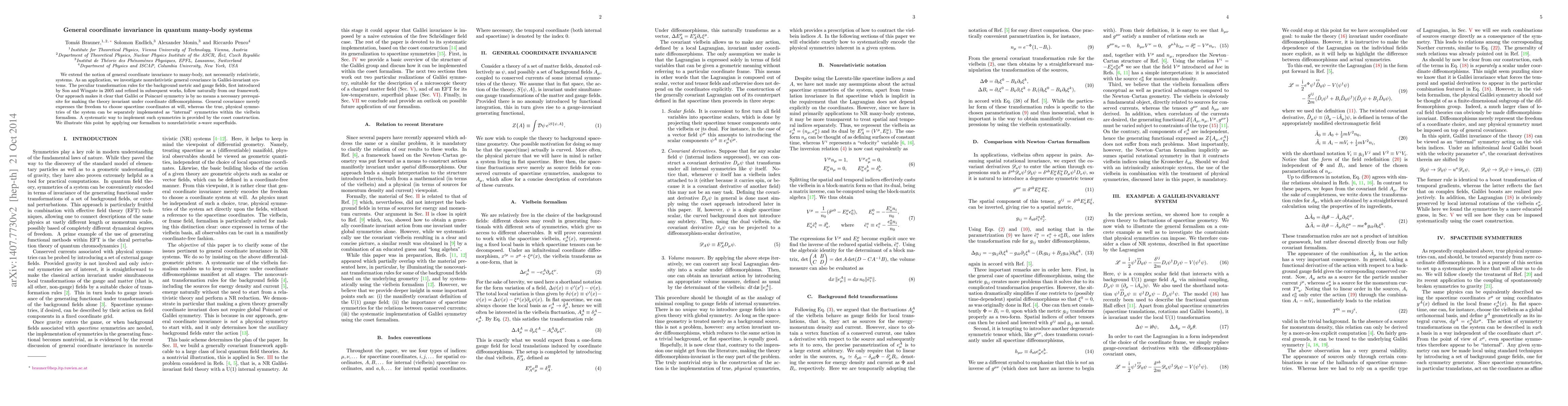 We extend the notion of general coordinate invariance to many-body, not necessarily relativistic, systems. As an application, we investigate nonrelativistic general covariance in Galilei-invariant systems. The peculiar transformation rules for the background metric and gauge fields, first introduced by Son and Wingate in 2005 and refined in subsequent works, follow naturally from our framework. Our approach makes it clear that Galilei or Poincare symmetry is by no means a necessary prerequisite for making the theory invariant under coordinate diffeomorphisms. General covariance merely expresses the freedom to choose spacetime coordinates at will, whereas the true, physical symmetries of the system can be separately implemented as "internal" symmetries within the vielbein formalism. A systematic way to implement such symmetries is provided by the coset construction. We illustrate this point by applying our formalism to nonrelativistic s-wave superfluids.