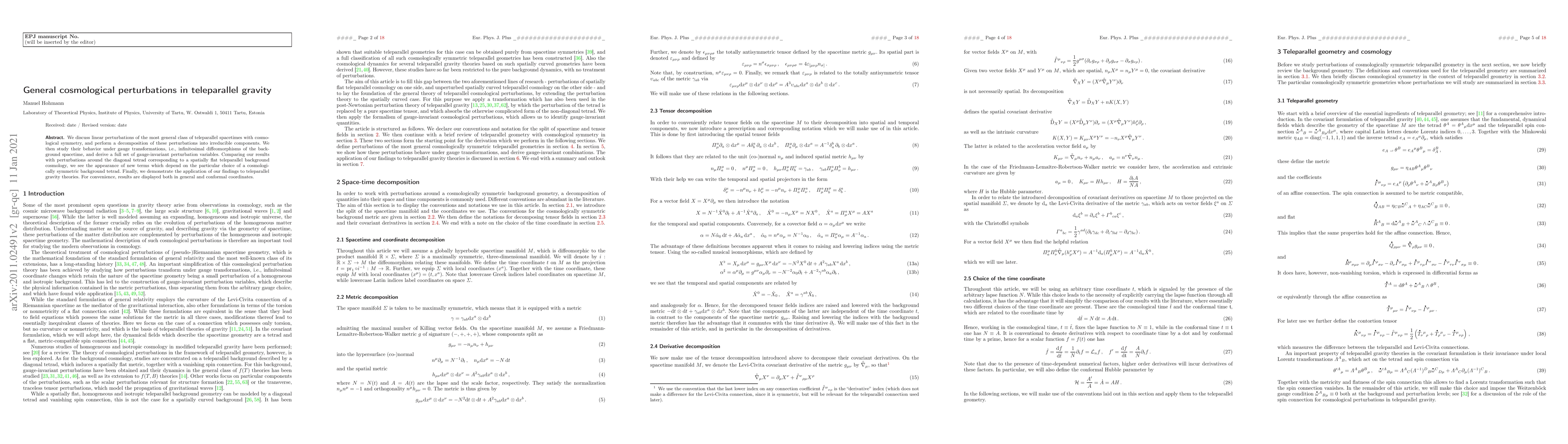 This paper investigates linear cosmological perturbations in teleparallel gravity, decomposes them into irreducible components, and derives gauge-invariant variables. It reveals new terms dependent on the choice of a cosmologically symmetric background tetrad and applies the findings to teleparallel gravity theories, presenting results in both general and conformal coordinates.