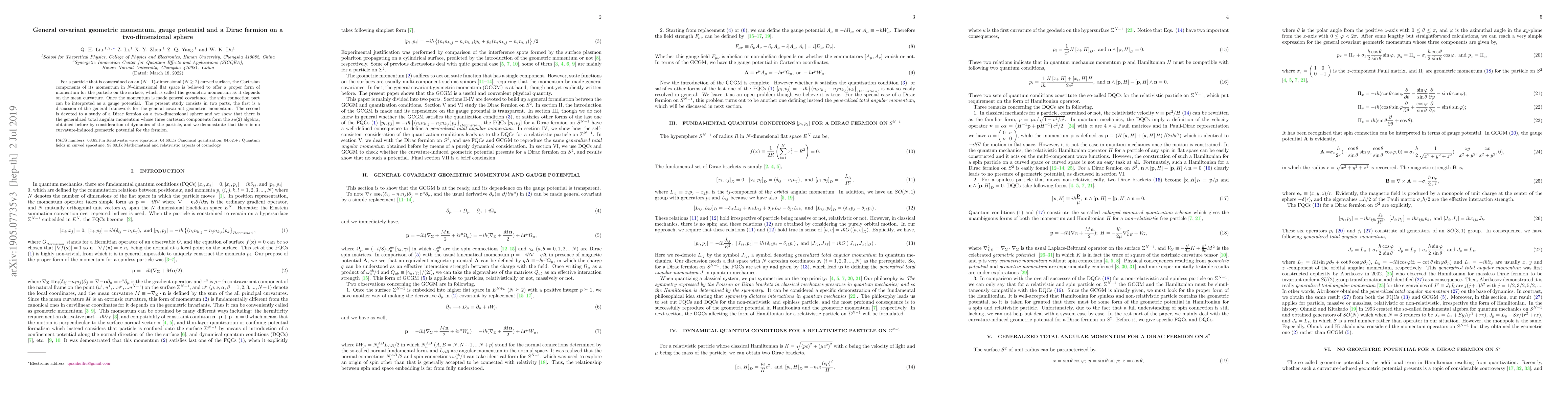 For a particle that is constrained on an ($N-1$)-dimensional ($N\geq2$) curved surface, the Cartesian components of its momentum in $N$-dimensional flat space is believed to offer a proper form of momentum for the particle on the surface, which is called the geometric momentum as it depends on the mean curvature. Once the momentum is made general covariance, the spin connection part can be interpreted as a gauge potential. The present study consists in two parts, the first is a discussion of the general framework for the general covariant geometric momentum. The second is devoted to a study of a Dirac fermion on a two-dimensional sphere and we show that there is the generalized total angular momentum whose three cartesian components form the $su(2)$ algebra, obtained before by consideration of dynamics of the particle, and we demonstrate that there is no curvature-induced geometric potential for the fermion.