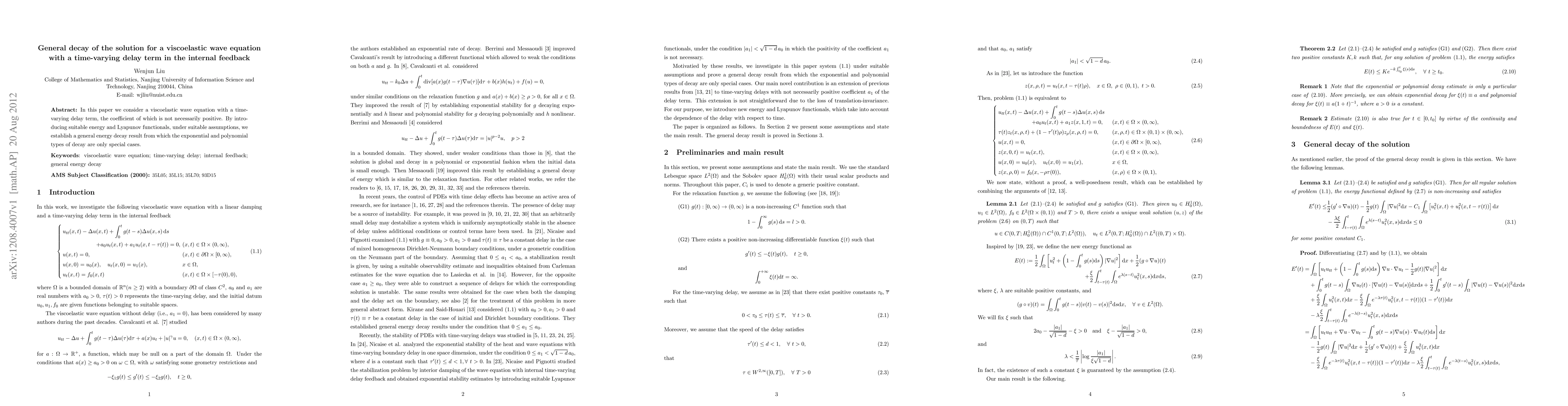 Summary: This paper investigates a viscoelastic wave equation with a time-varying delay term, establishing general energy decay results. Suitable energy and Lyapunov functionals are used to demonstrate that both exponential and polynomial decay types are special cases of the general decay.