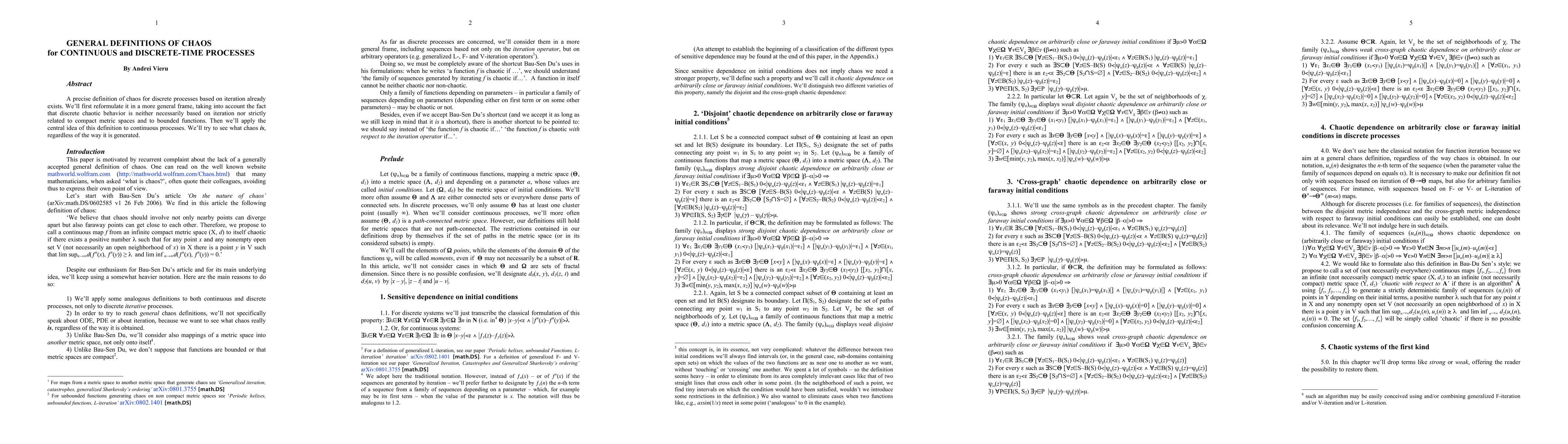 This paper reformulates the definition of chaos for discrete-time processes beyond traditional iteration-based frameworks and applies these generalized concepts to continuous-time processes to explore chaos irrespective of its generation method.