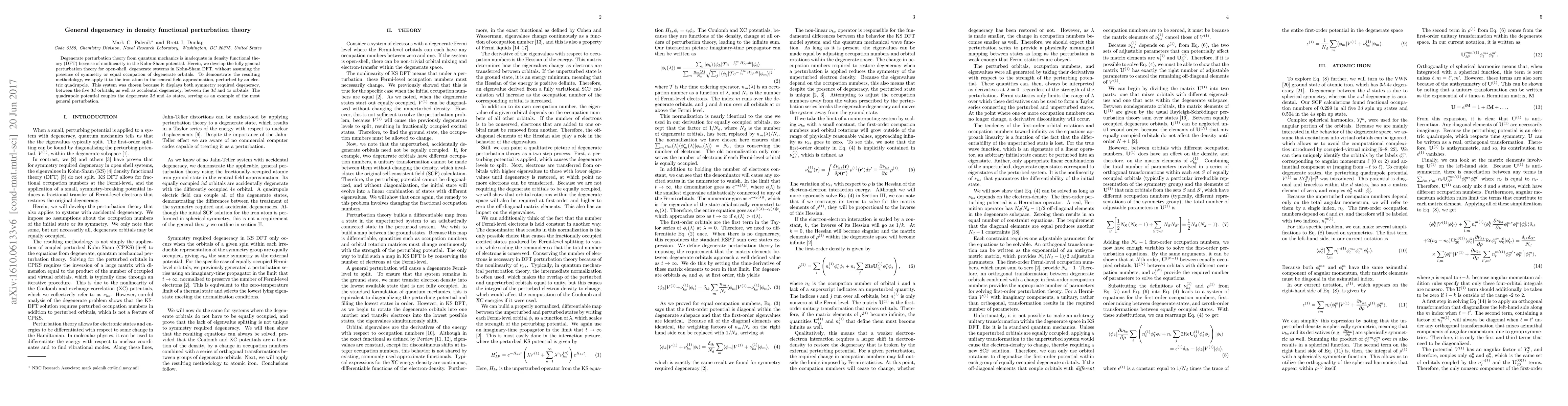 This paper develops a general perturbation theory for open-shell, degenerate systems in Kohn-Sham density functional theory, applicable without symmetry or equal occupation assumptions. It demonstrates the methodology by analyzing the iron atom under an electric quadrupole perturbation, showcasing both symmetry and accidental degeneracies.