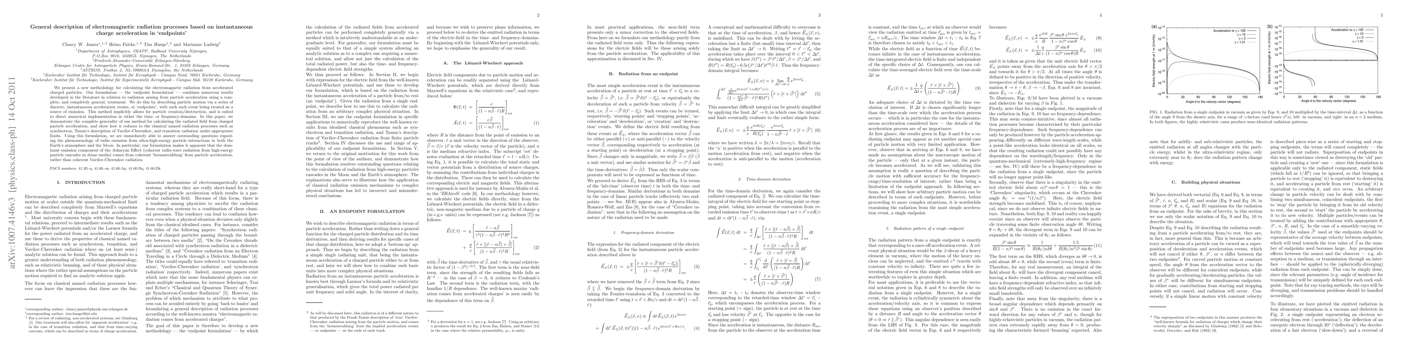 We present a new methodology for calculating the electromagnetic radiation from accelerated charged particles. Our formulation --- the `endpoint formulation' --- combines numerous results developed in the literature in relation to radiation arising from particle acceleration using a complete, and completely general, treatment. We do this by describing particle motion via a series of discrete, instantaneous acceleration events, or `endpoints', with each such event being treated as a source of emission. This method implicitly allows for particle creation/destruction, and is suited to direct numerical implementation in either the time- or frequency-domains. In this paper, we demonstrate the complete generality of our method for calculating the radiated field from charged particle acceleration, and show how it reduces to the classical named radiation processes such as synchrotron, Tamm's description of Vavilov-Cherenkov, and transition radiation under appropriate limits. Using this formulation, we are immediately able to answer outstanding questions regarding the phenomenology of radio emission from ultra-high-energy particle interactions in both the Earth's atmosphere and the Moon. In particular, our formulation makes it apparent that the dominant emission component of the Askaryan Effect (coherent radio-wave radiation from high-energy particle cascades in dense media) comes from coherent `bremsstrahlung' from particle acceleration, rather than coherent Vavilov-Cherenkov radiation.