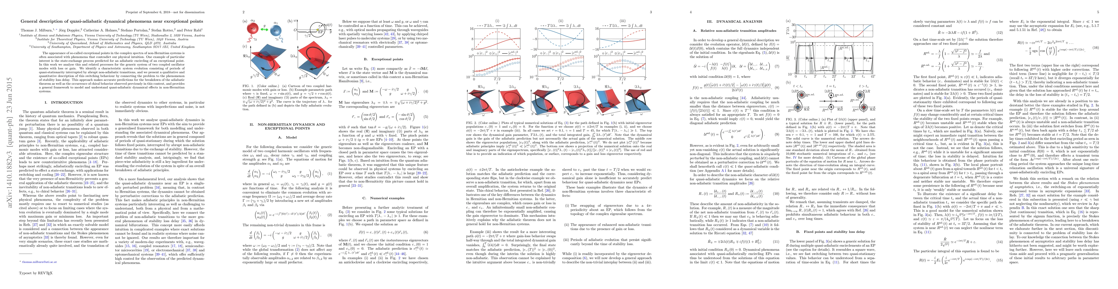 This paper investigates quasi-adiabatic dynamical phenomena near exceptional points in non-Hermitian systems, focusing on coupled oscillator modes with loss or gain. It identifies periods of quasi-stationarity interrupted by abrupt transitions, linking these behaviors to stability loss delay and providing a framework for understanding such dynamics.