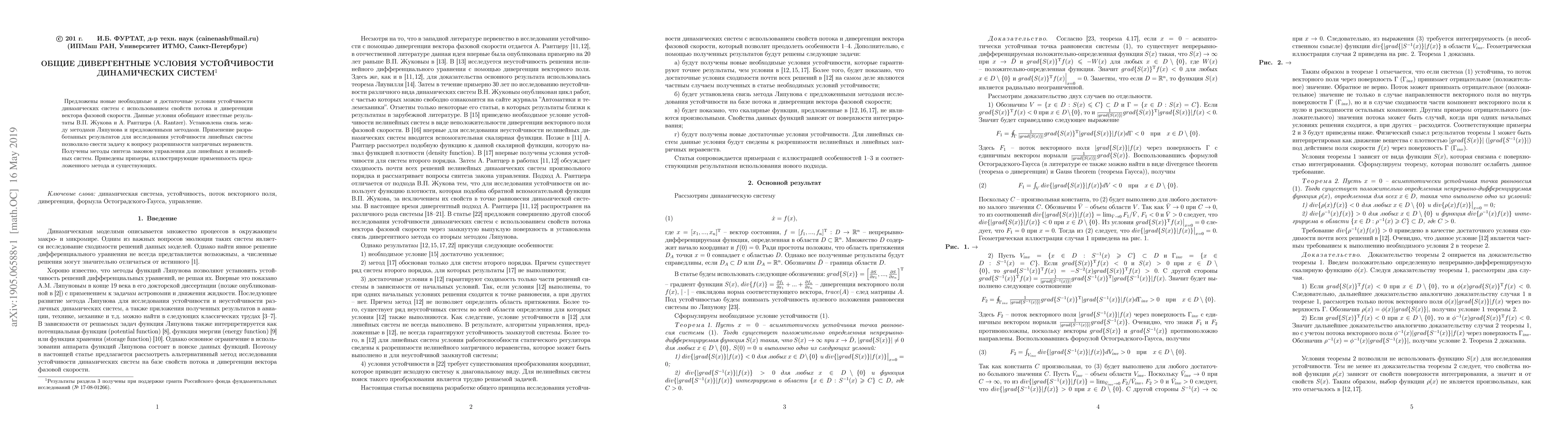 New necessary and sufficient conditions are proposed for the stability investigation of dynamical systems using the flow and the divergence of the phase vector velocity. The obtained conditions generalize the well-known results of V.P. Zhukov and A. Rantzer. The relation of Lyapunov methods with the proposed methods is established. The application of the obtained results to study the stability of linear systems goes to the problem of matrix inequality solvability. The new control laws are synthesized for linear and nonlinear systems. Examples illustrate the applicability of the proposed method and show the comparison results with some existing ones.