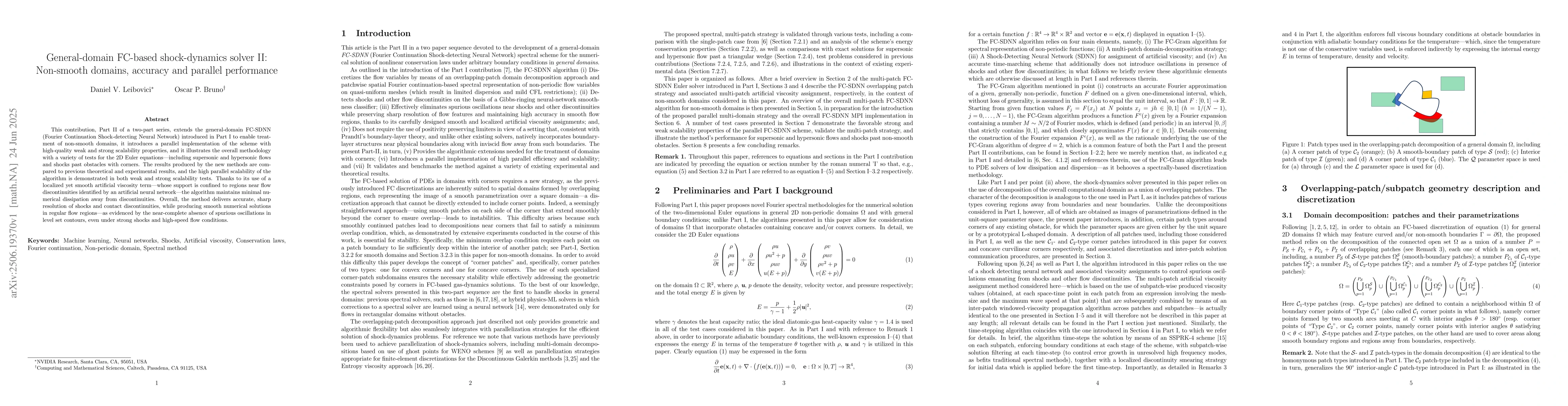 This contribution Part II of a two-part series, extends the general-domain FC-SDNN (Fourier Continuation Shock-Detecting Neural Network) introduces in Part I to enable treatment of non-smooth domains, it introduces a parallel implementation of the scheme with high-quality weak and strong scalability properties, and it illustrates the overall methodology for a variety of tests for the 2D Euler equations--including supersonic and hypersonic flows and shocks past obstacles with corners. The results produces by the new methods are compared to previous theoretical and experimental results, and the high parallel scalability of the algorithm is demonstrated in both weak and strong scaling cases. Thanks to its use of a localized yet smooth artificial viscosity term--whose support is confined to regions near flow discontinuities identified by an artificial neural network--the algorithm maintains minimal numerical dissipation away from discontinuities. Overall, the method delivers accurate, sharp resolution of shocks and contact discontinuities, while producing smooth numerical solutions in regular flow regions--as evidences by the near-complete absence of spurious oscillations in level-set contours, even under strong shocks and high-speed flow conditions.