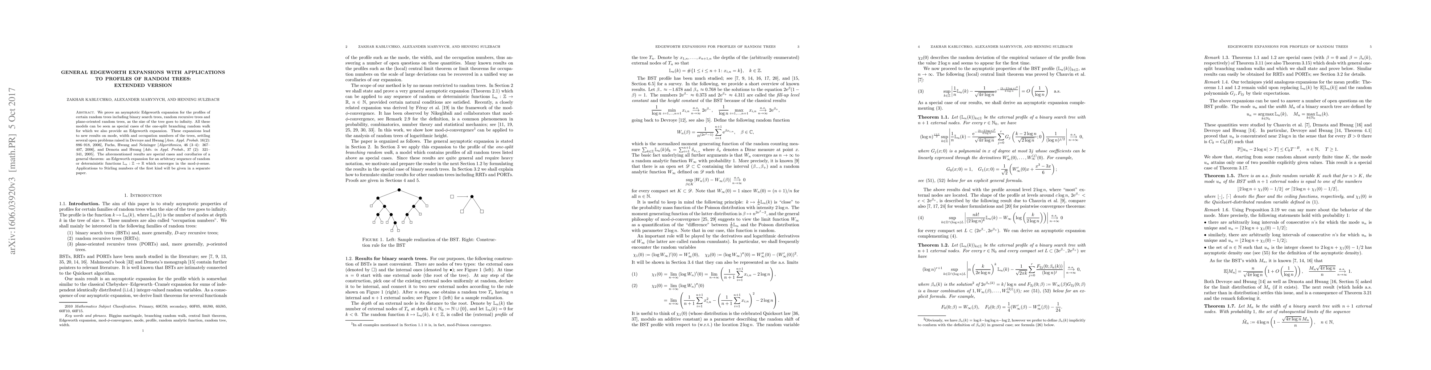 We prove an asymptotic Edgeworth expansion for the profiles of certain random trees including binary search trees, random recursive trees and plane-oriented random trees, as the size of the tree goes to infinity. All these models can be seen as special cases of the one-split branching random walk for which we also provide an Edgeworth expansion. These expansions lead to new results on mode, width and occupation numbers of the trees, settling several open problems raised in Devroye and Hwang [Ann. Appl. Probab. 16(2): 886--918, 2006], Fuchs, Hwang and Neininger [Algorithmica, 46 (3--4): 367--407, 2006], and Drmota and Hwang [Adv. in Appl. Probab., 37 (2): 321--341, 2005]. The aforementioned results are special cases and corollaries of a general theorem: an Edgeworth expansion for an arbitrary sequence of random or deterministic functions $\mathbb L_n:\mathbb Z\to\mathbb R$ which converges in the mod-$\phi$-sense. Applications to Stirling numbers of the first kind will be given in a separate paper.