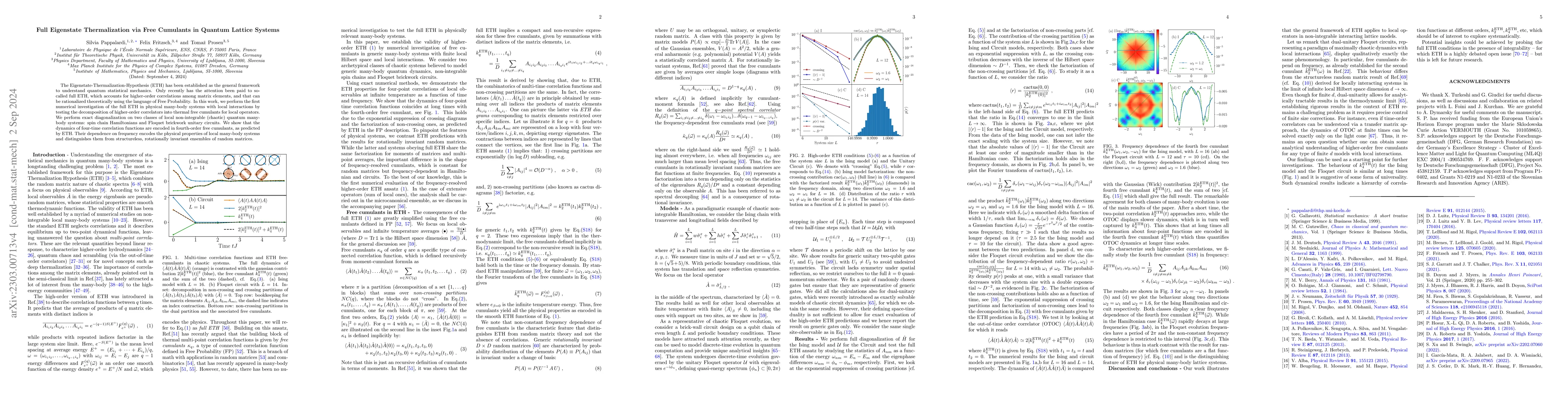 This paper investigates the general Eigenstate-Thermalization-Hypothesis (ETH) in quantum lattice systems using free cumulants, demonstrating that higher-order correlators decompose into these cumulants. Through exact diagonalization of spin chain and Floquet brickwork systems, it shows that the dynamics of four-time correlation functions align with predictions from ETH, highlighting the unique physical properties of these systems.